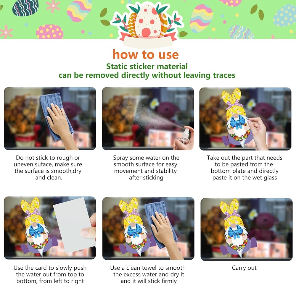 【ملصقات ثابتة】يتم استخدام هذا النوع من ملصقات النوافذ على شكل جنوم عيد الفصح بدون صمغ، وتستخدم مبدأ الامتصاص الكهروستاتيكي، والذي يمكن ربطه بسهولة بنافذة زجاجية نظيفة ويمكن إعادة استخدامه. يرجى مسح النافذة بقطعة قماش نظيفة قبل الاستخدام.