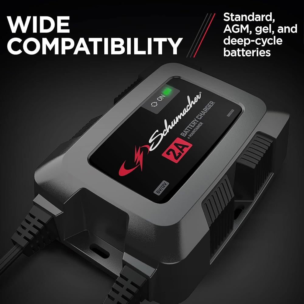 شحن متعدد الاستخدامات وعالي التقنية - يعمل شاحن بطارية Schumacher SC1586 1A + الشاحن مع مجموعة واسعة من أنواع البطاريات، بما في ذلك البطاريات القياسية وAGM والجيل والليثيوم وبطاريات الدورة العميقة. ويتميز بشحن متعدد المراحل ومراقبة الوضع العائم لضمان صحة البطارية المثالية وعمر البطارية الممتد.