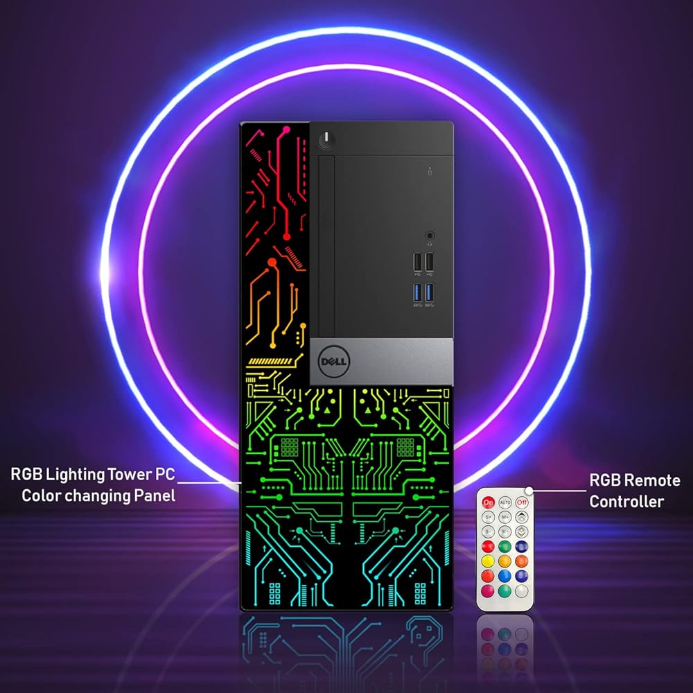 • 🌈 لوحة أضواء RGB: يأتي برج الكمبيوتر المكتبي من Dell مزودًا بإضاءة RGB LED على اللوحة الأمامية. يمكن تغيير الإضاءة باستخدام جهاز التحكم عن بعد وضبط سرعة الإضاءة والوضع بسرعة مع العديد من أنماط تغيير الألوان.