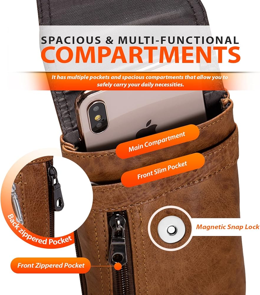 مساحات واسعة ومتعددة الوظائف: تحتوي محفظة الهاتف ذات المشبك على جيوب متعددة ومقصورات واسعة تسمح لك بحمل ضرورياتك اليومية بأمان. الحجرة الرئيسية واسعة بما يكفي لحمل جهاز هاتف ذكي كبير، بالإضافة إلى جيب رفيع وجيوب أمامية وخلفية بسحاب للنقود والإيصالات والبطاقات.