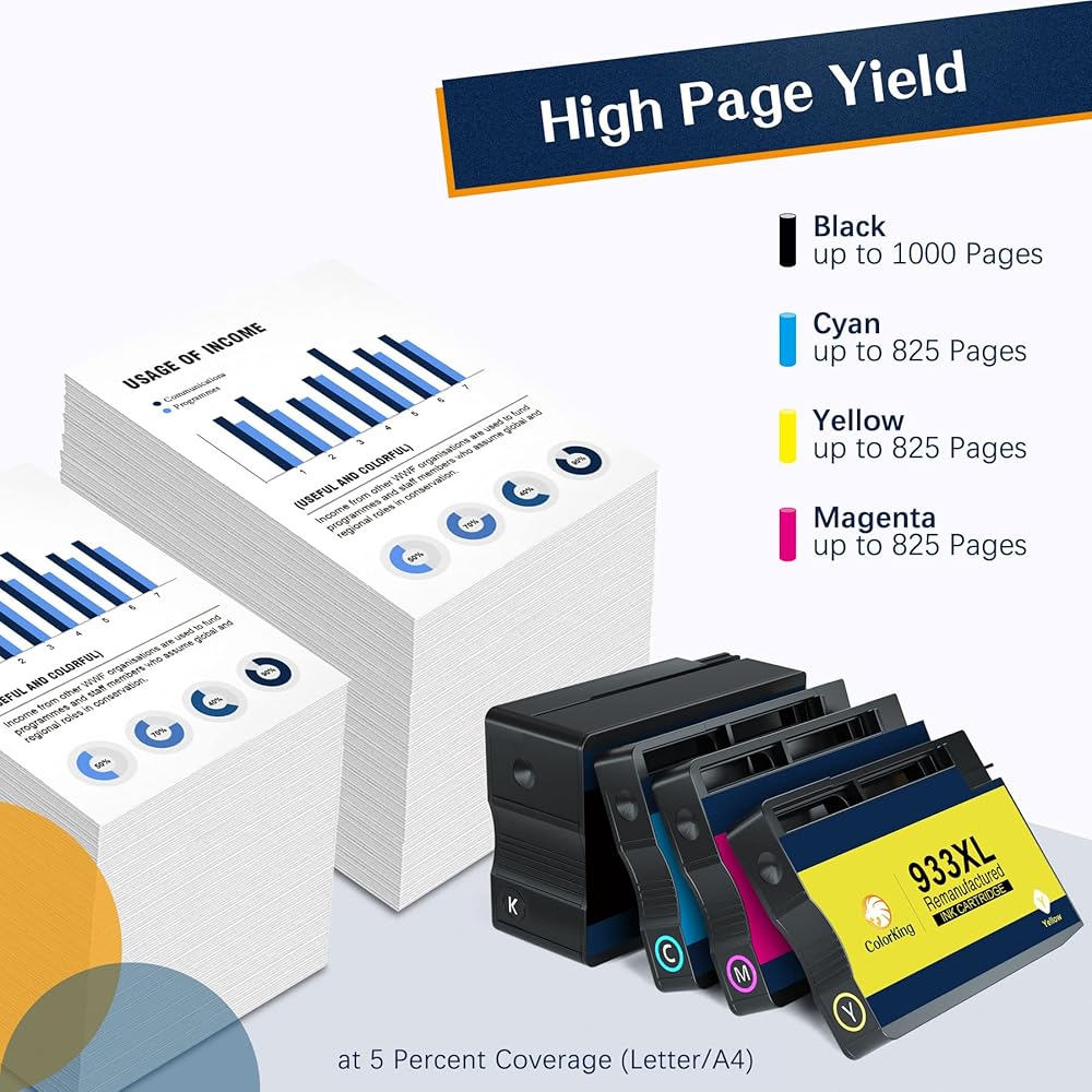 إنتاجية عالية للصفحة: 1000 صفحة لكل خرطوشة حبر سوداء 932XL 933XL 932 XL 933 XL، 825 صفحة لكل خرطوشة حبر ملونة 932XL 933XL 932 XL 933 XL بتغطية 5 بالمائة