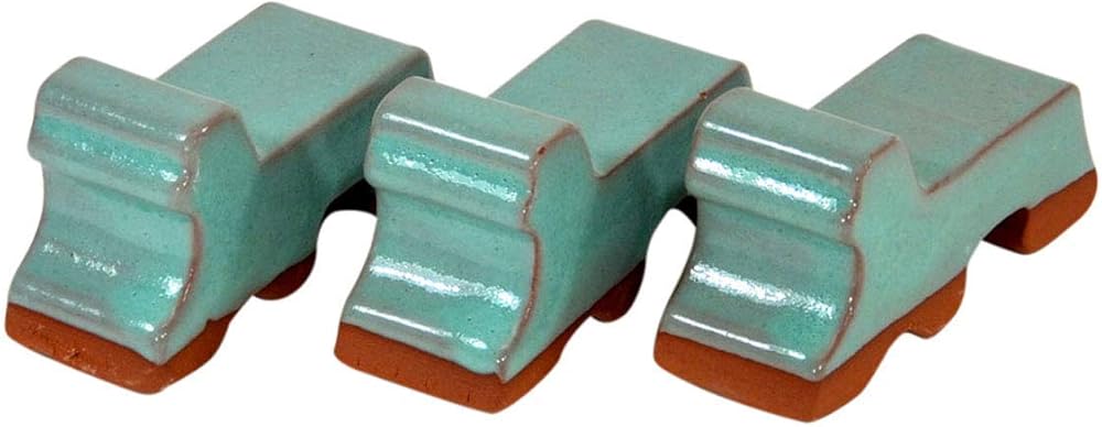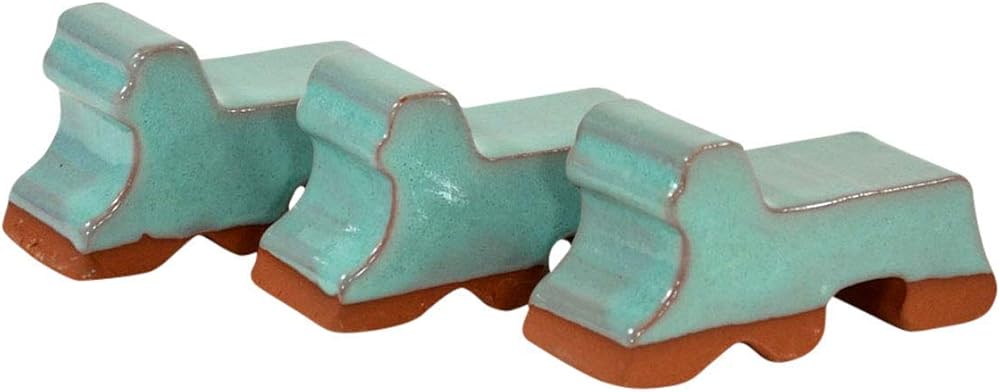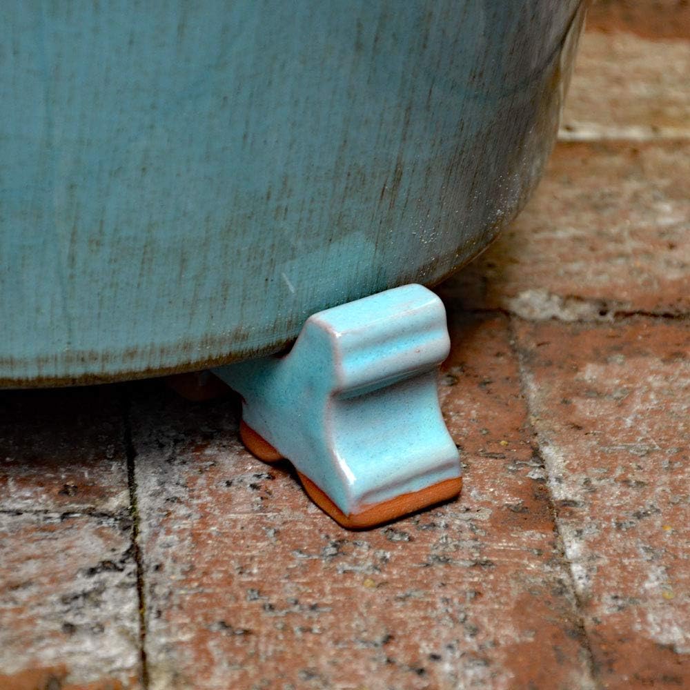 These weathered copper Handmade Potrisers or Pot Feet are great for any planter or pot. They were designed to stylishly raise the container off the ground to prevent staining of patio or deck and provide improved airflow. Hand-dipped using glazes made in our shop. Made from all-weather Frost Proof clay. 3″ long x 1.5″ tall (Recommended for 14"-20" Pots)