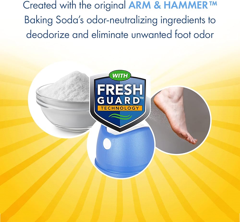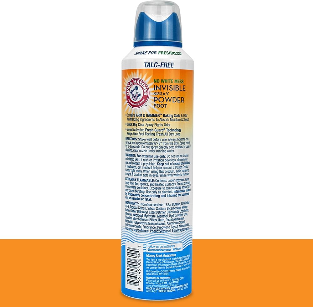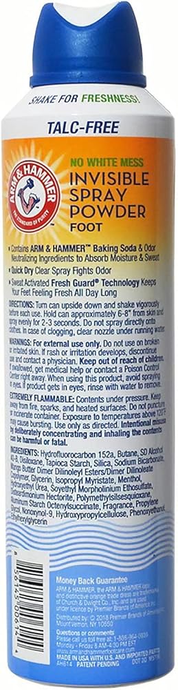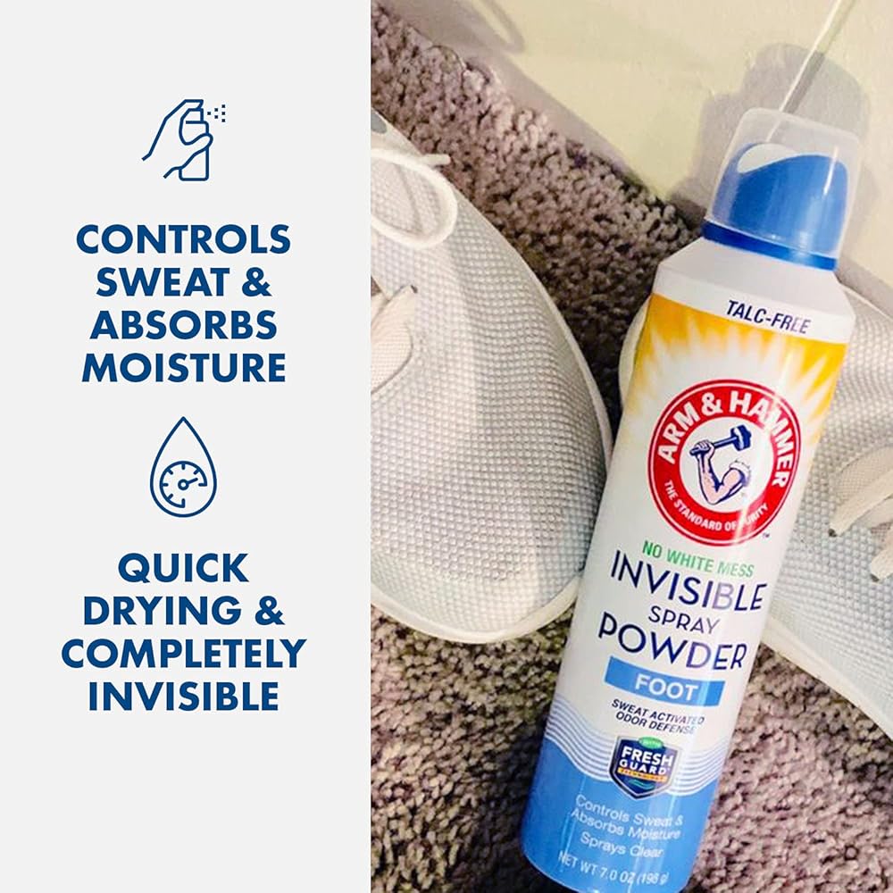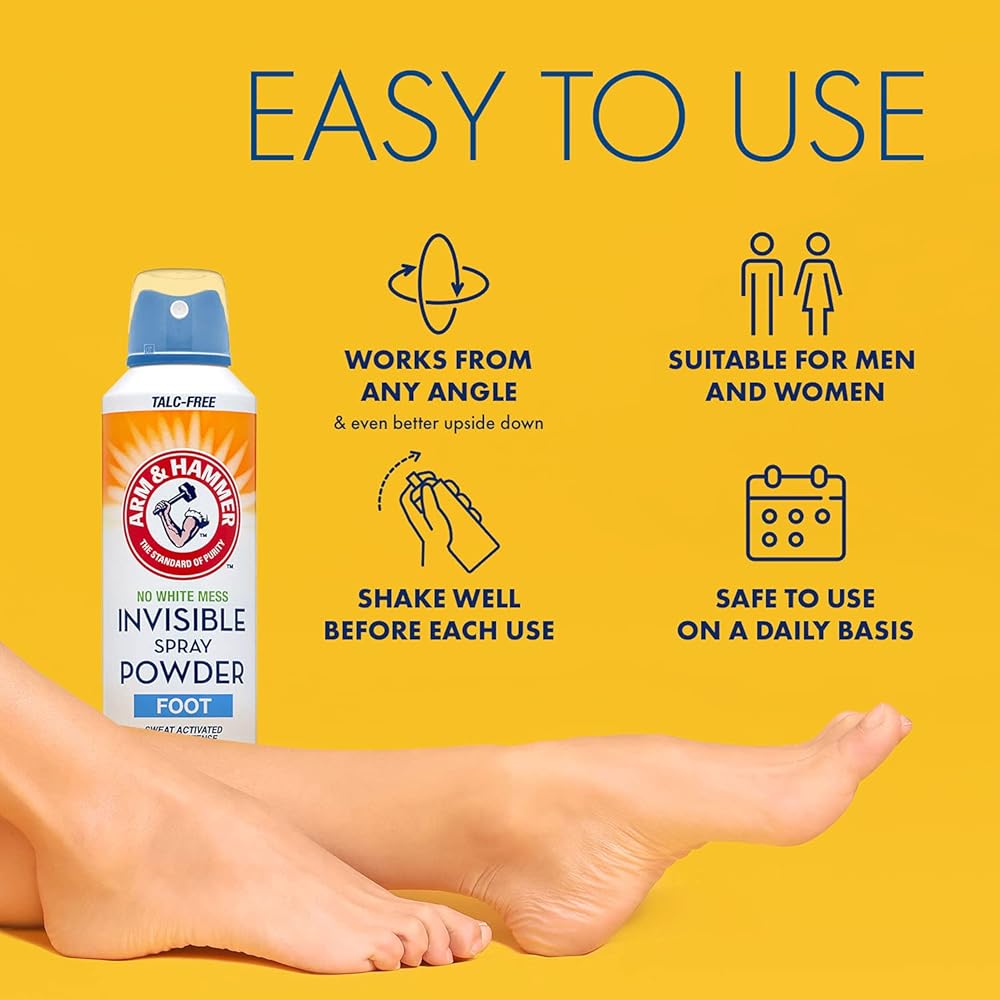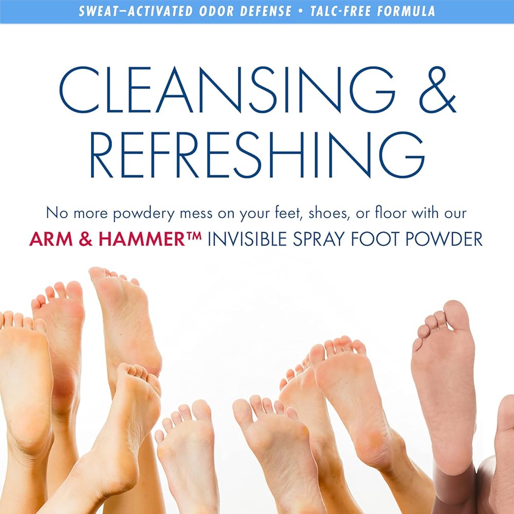 التنظيف والانتعاش - لا مزيد من الفوضى البودرة على قدميك أو حذائك أو الأرضية؛ مسحوق رش غير مرئي خالٍ من التلك من آرم آند هامر يتحكم بفعالية في العرق ويمتص الرطوبة من قدميك ليبقى منتعشًا دون إحداث فوضى.