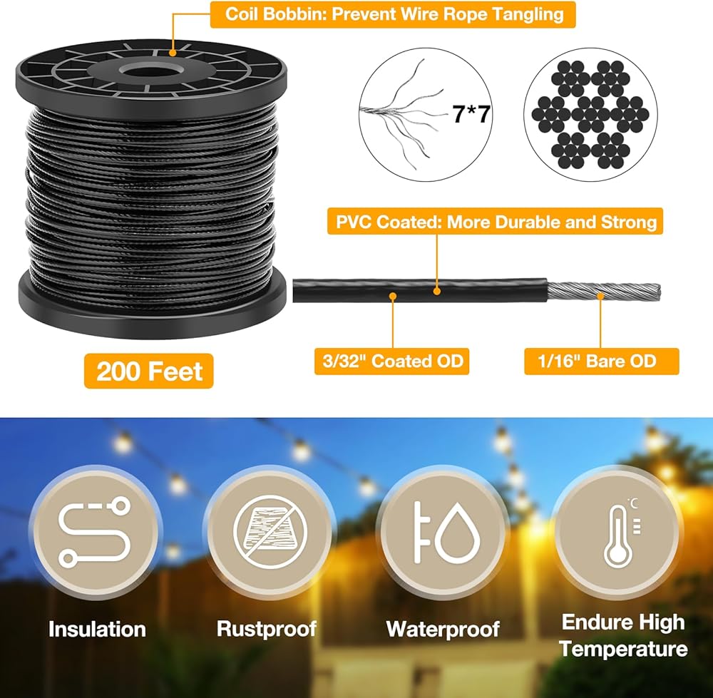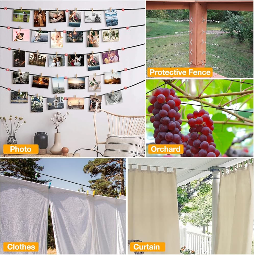【تطبيقات واسعة】سلك التعليق الخاص بنا مثالي للاستخدام الداخلي والخارجي، ويمكن استخدامه بطرق متعددة مثل سلسلة أضواء التعليق لحفلة رومانسية، والفناء، والحديقة، والشرفة، والفناء الخلفي ومجموعة تعليق الصور الرائعة، وسلك لخط الملابس، وأشرعة الظل. ، نباتات التسلق، نظام تعليق الستارة السلكية أو أي تعليق مطلوب
