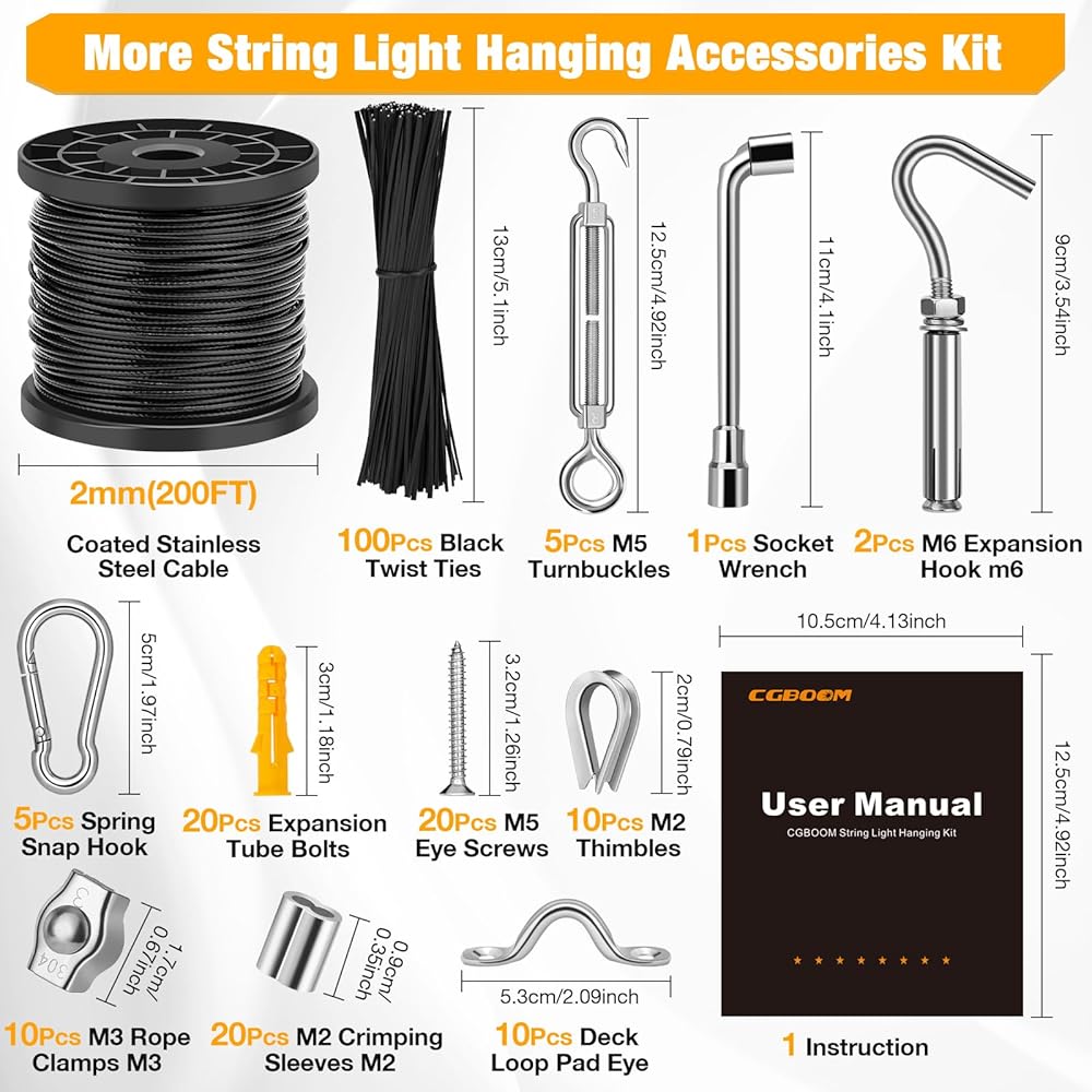 【المزيد من الإكسسوارات】توفر مجموعة تعليق سلسلة CGBOOM جميع الأدوات التي تحتاجها تقريبًا، بما في ذلك سلك فولاذي بطول 200 قدم، و5 قطع من شدادات M5، وخطاف توسيع M6، و5 قطع خطاف زنبركي، و10 قطع من مجموعة البراغي، و10 قطع من كشتبانات M2 10 قطع مفتاح ربط M31، 100 قطعة ربطات عنق سوداء ودليل مستخدم واحد.