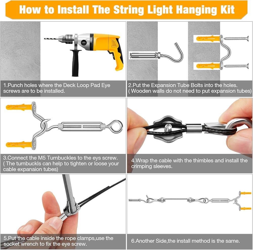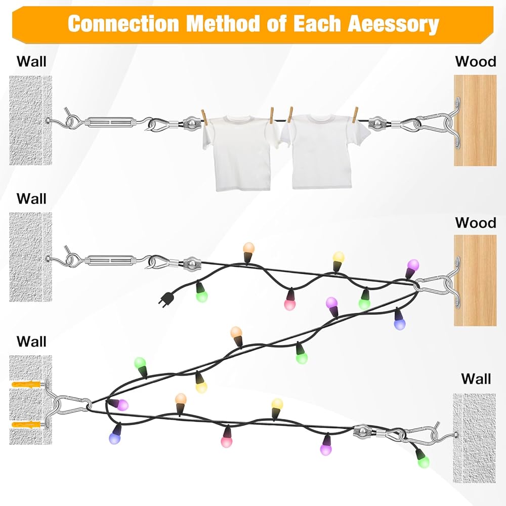 【سهلة التركيب】كل مكون من مجموعة الأسلاك المعلقة هذه ملولب ولا يتطلب أدوات إضافية لإكمال المشروع. الملحقات مدمجة للغاية وسهلة التجميع أو التفكيك. علاوة على ذلك، يتم توفير تعليمات مفصلة لجعل وضع السلك الفولاذي مهمة بسيطة بغض النظر عن الخشب أو الخشب أو الجدار الخرساني.