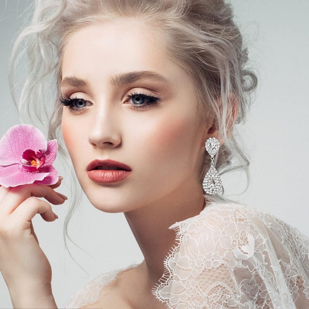 THUNARAZ مشبك فضي على أقراط للنساء من حجر الراين المتلألئ أقراط مشبكية للزفاف ثريا رسمية على شكل دمعة أقراط متدلية للعرائس ووصيفات العروس مجوهرات غير مثقوبة للحفلات الراقصة