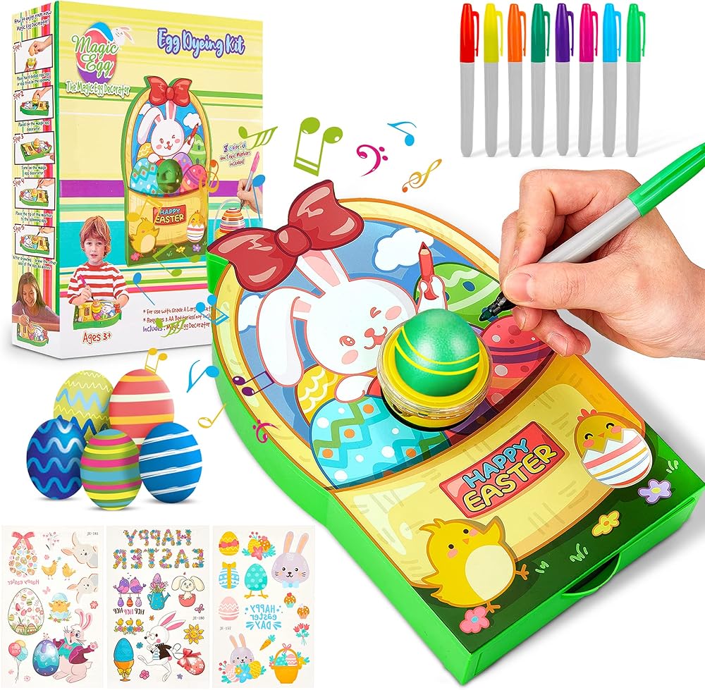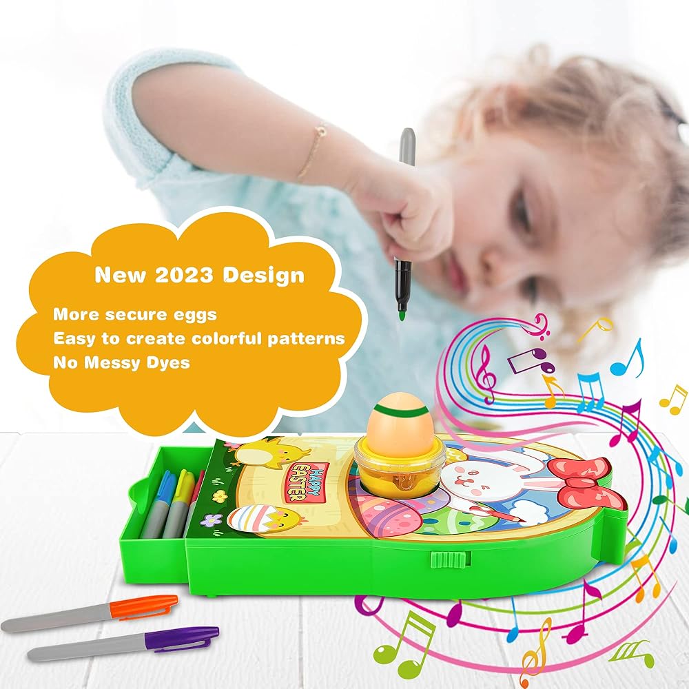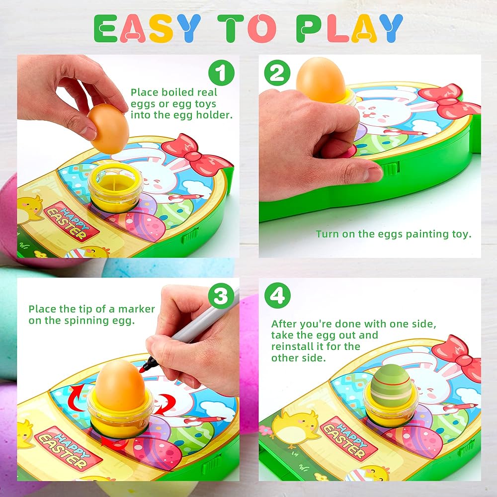 🐰 مجموعات تزيين بيض عيد الفصح سهلة الاستخدام - يتطلب جهاز تزيين البيض الدوار 3 بطاريات AA في الأسفل (غير متضمنة). ضع بيضة في الآلة، وقم بتشغيل المفتاح، وسوف تعمل الموسيقى والأضواء ويبدأ الدوار في الدوران. يمكن للأطفال إنشاء تصميمات مثيرة لا حصر لها من خلال حركة الدوران الفريدة ولمسة قلم التحديد.