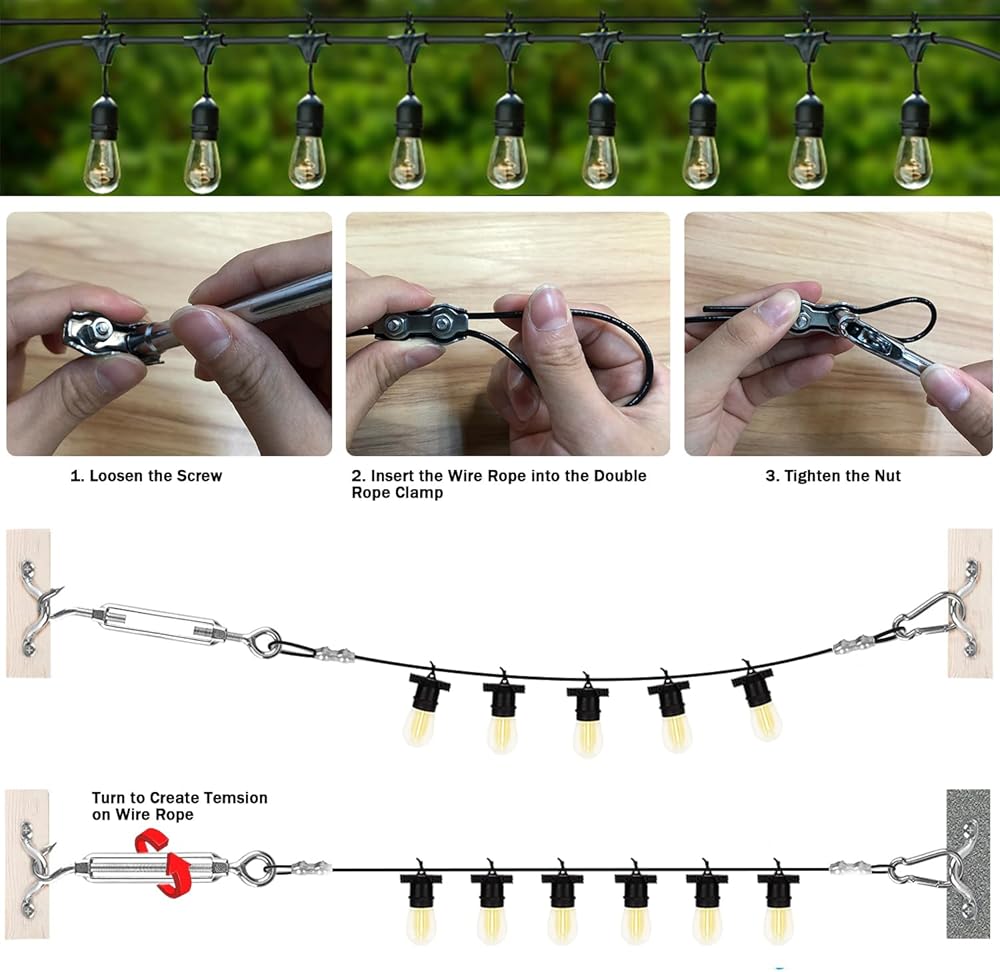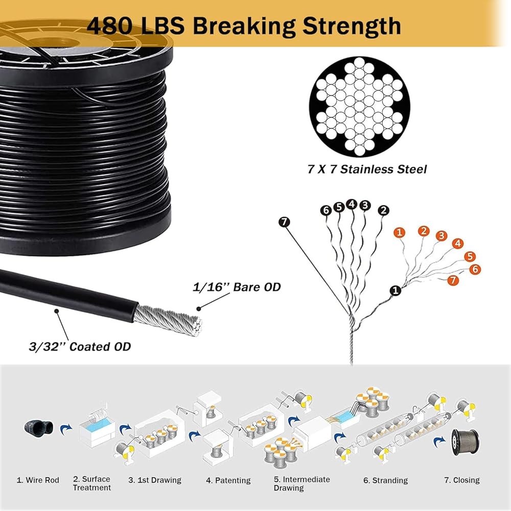【مجموعة تعليق الضوء بسلسلة عالية القوة】 حبل سلك معلق للأضواء الخارجية مصنوع من الفولاذ المقاوم للصدأ 304 مع طلاء من النايلون. قلب من الفولاذ المقاوم للصدأ بقطر 1/16 بوصة مضفر 7x7 يسمح بقوة كسر ثابتة تصل إلى 480 رطل. بمجرد سحب الكابل بإحكام، يكون قويًا بما يكفي لتعليق ضوء الخيط الثقيل في منطقة مفتوحة كبيرة دون ترهل.