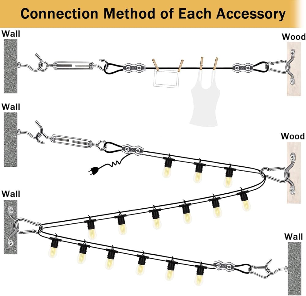 【استخدام واسع】مجموعة تعليق سلسلة الإضاءة لأي مشروع معلق. طقم أدوات شراع الظل، طقم أسلاك، حبال غسيل، صور معلقة. تأتي مجموعة الحبال السلكية مع قواطع للأسلاك، يمكنك اختيار أطوال مختلفة حسب استخدامك.