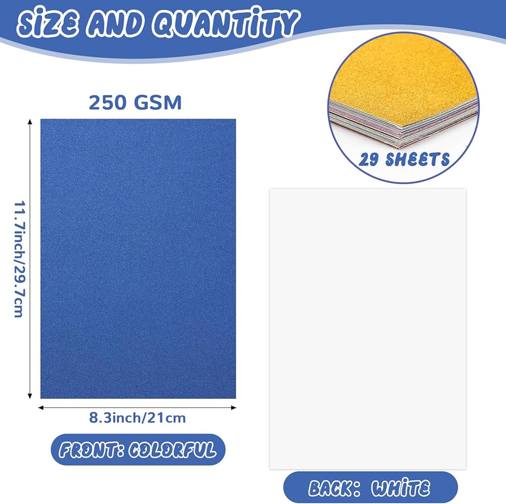 تتضمن العبوة: تحتوي هذه العبوة على 29 ورقة من ورق البطاقات اللامع متعدد الألوان، مع قياس كل ورقة مقاس A4 القياسي (8.3 × 11.8 بوصة) ووزنها 250 جرامًا للمتر المربع.