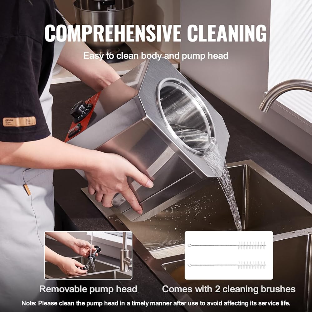 سعة كبيرة 2 × 2.4 لتر: يستخدم موزع الجبن المزود بمضخة خزانين من الفولاذ المقاوم للصدأ سعة 2.4 لتر (2.3 لتر)، يمكنهما حمل كمية كبيرة من الجبن أو الحلوى الساخنة. تتميز بموزع متين، بحيث يمكن للمضخة أيضًا توزيع الكريمات أو الصلصات الذائبة. إخراج فردي: 1/3 ~ 1 أونصة (10-30 مل).