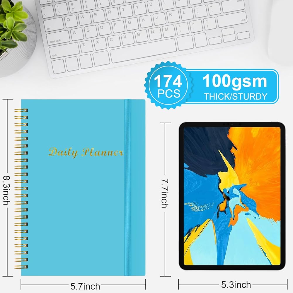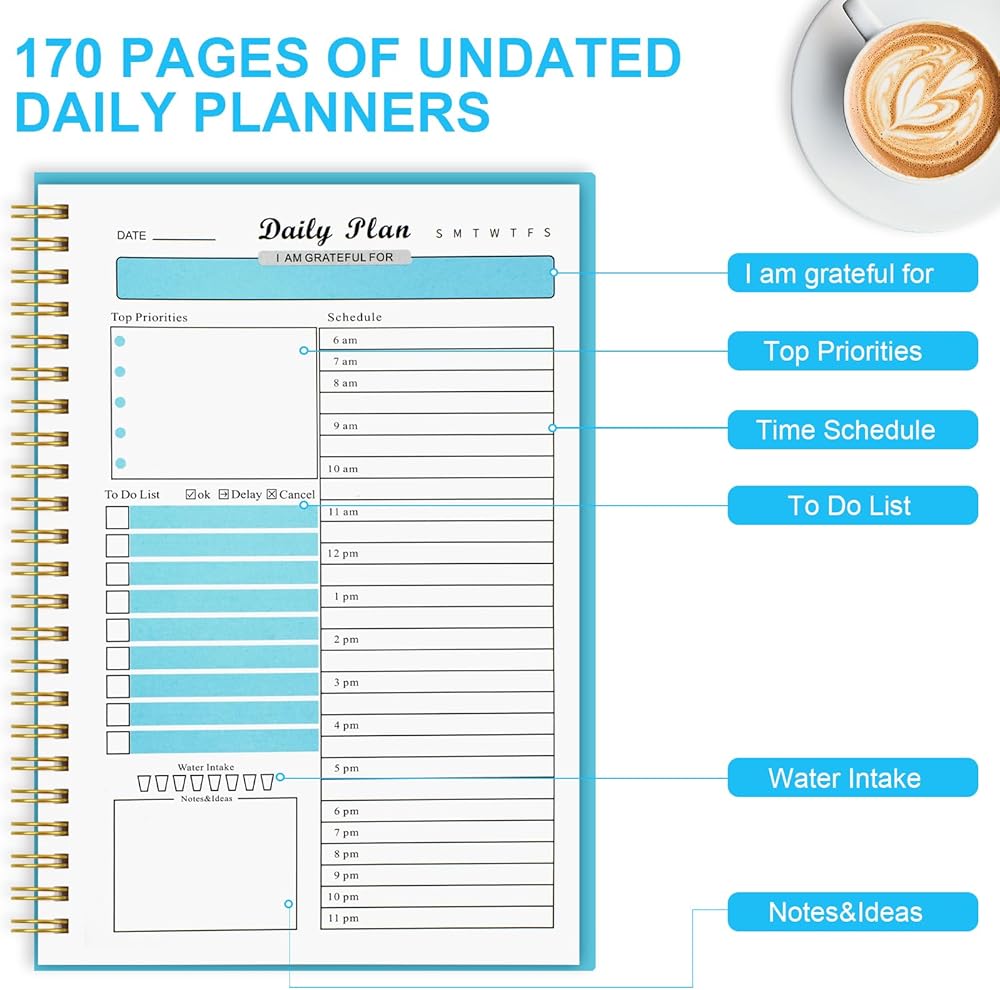 مواصفات المنتج: مخططنا اليومي A5 المجهز جيدًا بقياسات غير مؤرخة 8.3 بوصة × 5.7 بوصة، بإجمالي 87 ورقة (174 صفحة)، يحتوي الجزء الداخلي على 85 ورقة (170 صفحة) من المخطط اليومي، وصفحة واحدة من المعلومات الشخصية، 1 صفحة جهات الاتصال وصفحة واحدة من التقويم الشهري. جميع الصفحات الداخلية مصنوعة من ورق مزدوج الأوفست بوزن 100 جرام في المتر المربع، وهو ورق سميك يطبع ويكتب بوضوح ويمكن لمعظم الأقلام الكتابة عليه.