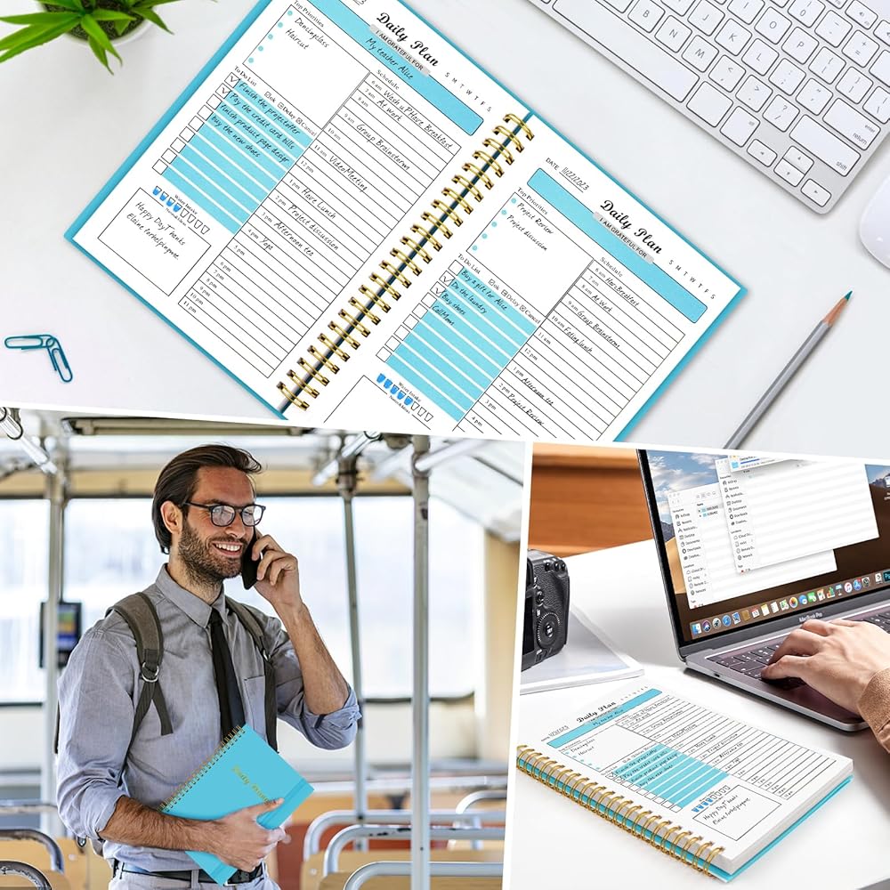 التخطيط اليومي: دفتر ملاحظات مخطط كل ساعة غير مؤرخ لتتبع ملاحظاتك وأفكارك وخططك الزمنية لمنع حياتك من التعجل، وتتبع أهدافك، وتحسين جودة حياتك. استخدم مخطط العمل لمساعدتك على إدارة حياتك اليومية وتحسين الكفاءة وتجعلك تشعر بالإنجاز في مشاريعك اليومية.
