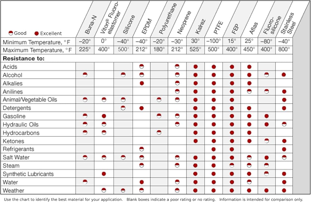 • تعمل هذه الحلقات الدائرية متعددة الاستخدامات بشكل جيد في الزيوت والوقود البترولي، والهيدروكربونات الأليفاتية، والزيوت النباتية، وزيوت وشحوم السيليكون، وجلايكول الإيثيلين، والأحماض المخففة، والماء إلى أقل من 100 درجة مئوية (212 درجة فهرنهايت).