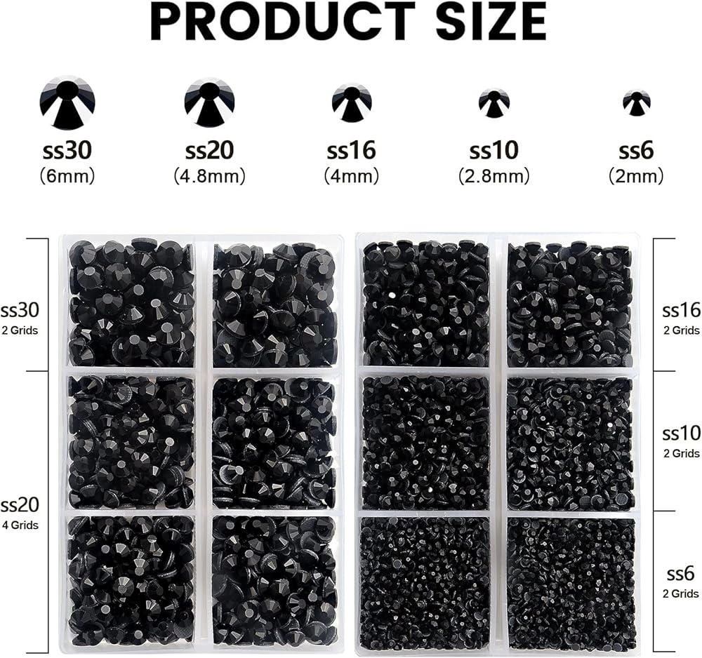 الحجم والكمية: 5 مقاسات مختلطة هي SS6(2مم)، SS10(2.8مم)، SS16(4مم)، SS20(4.8مم)، SS30(6مم)، تقريبًا. 7000 قطعة في المجموع. نصيحة دافئة: نحن لا نحسب أحجارنا بشكل فردي. يتم الحصول على أحجارنا بكميات كبيرة والكميات الموجودة في كل عبوة تقريبية.