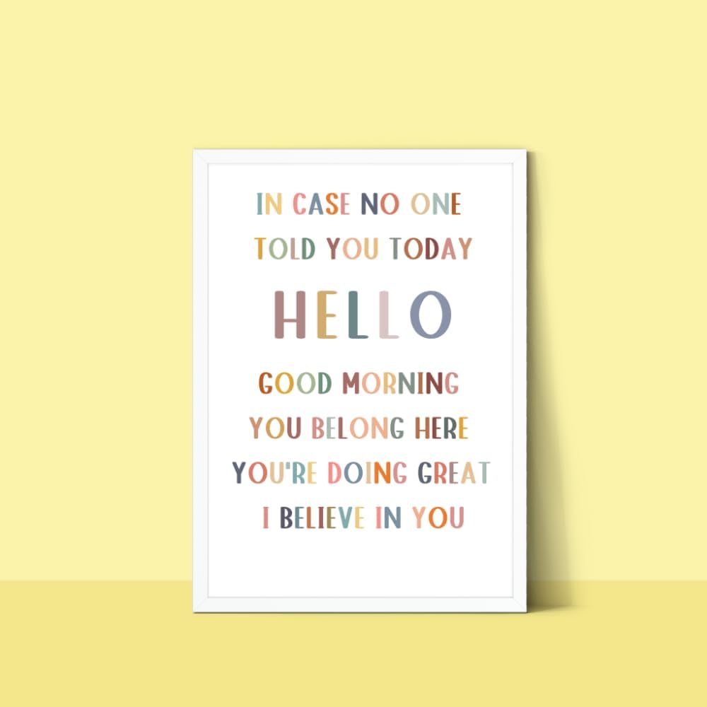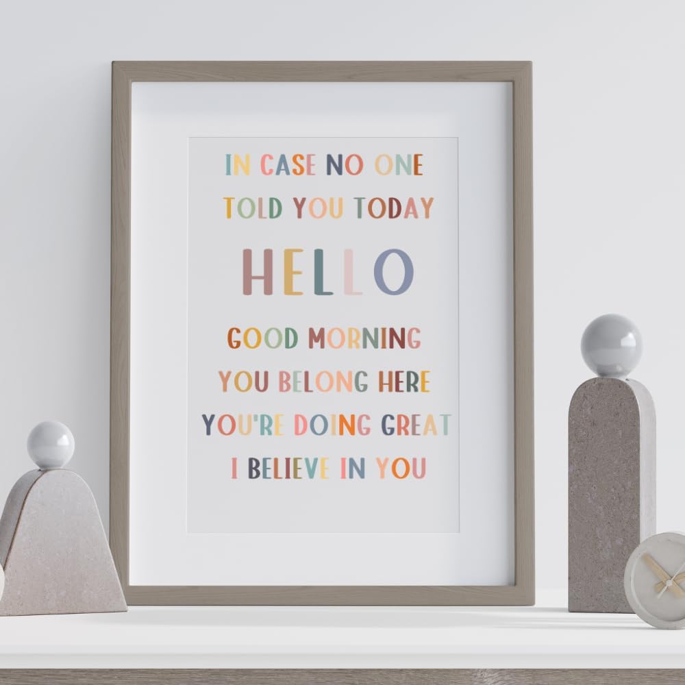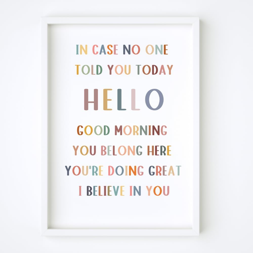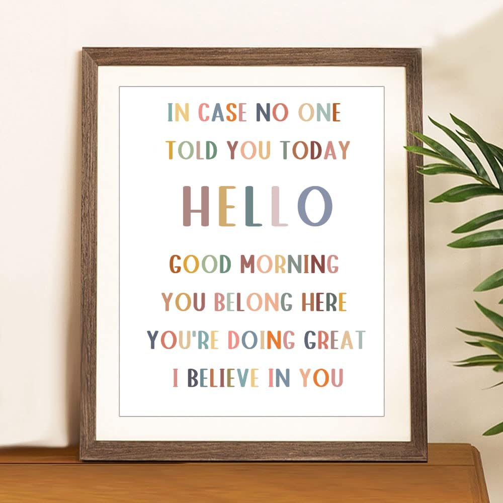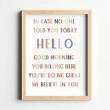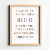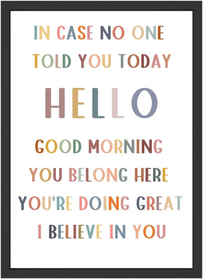 التشجيع الشامل: كلمات الملصق "في حال لم يخبرك أحد اليوم، مرحبًا صباح الخير، أنت تنتمي إلى هنا، أنت تقوم بعمل رائع، أنا أؤمن بك" توفر رسالة شاملة وتمكينية، وتعزز الشعور بالانتماء والتقدم والانتماء. يدعم.