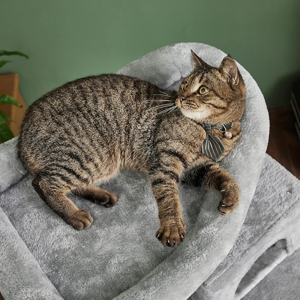 هيكل قوي: مصنوع من لوح جسيمات عالي الجودة وهياكل دعم قوية، يضمن برج القطط هذا الثبات والمتانة، مما يسمح لقطتك باللعب والراحة بأمان.