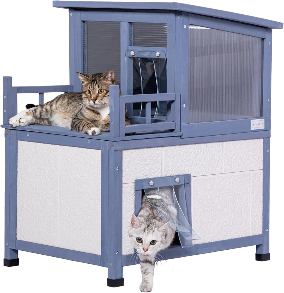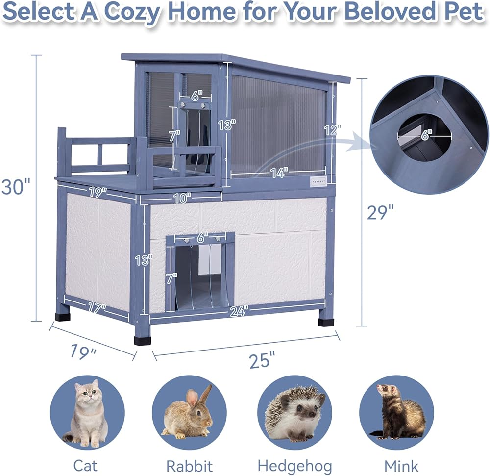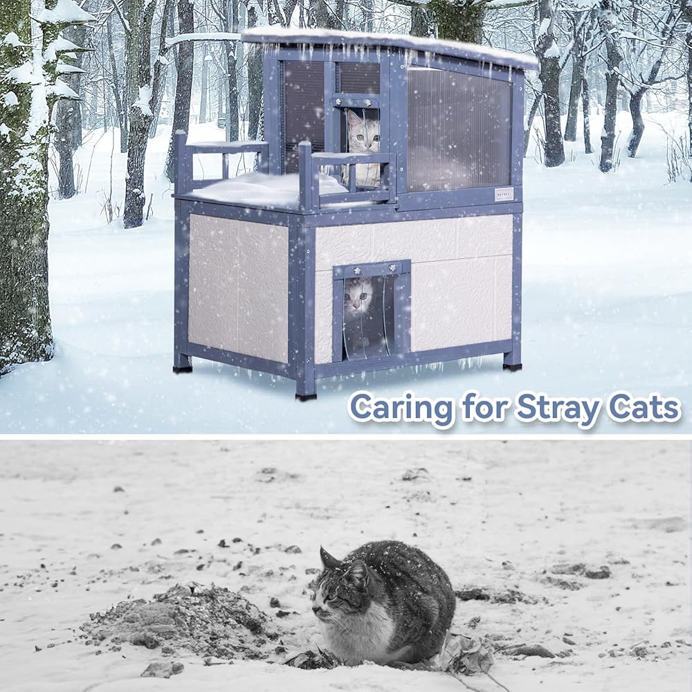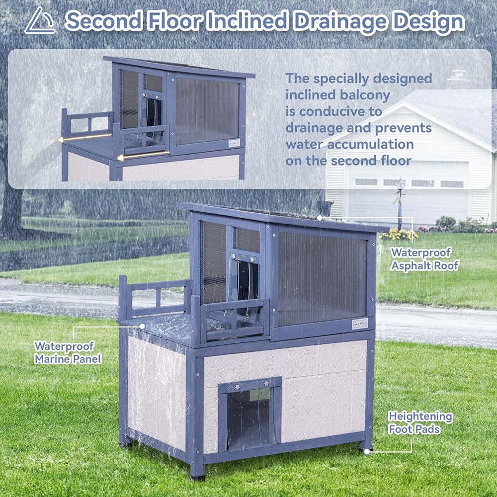 إنه بيت قطط معزول آمن وممتع في الهواء الطلق. يوجد نفق دائري للقطط يربط بين المستويين العلوي والسفلي، مما يسمح للقطط بالتحرك بحرية بين الطوابق أو لعب الغميضة.