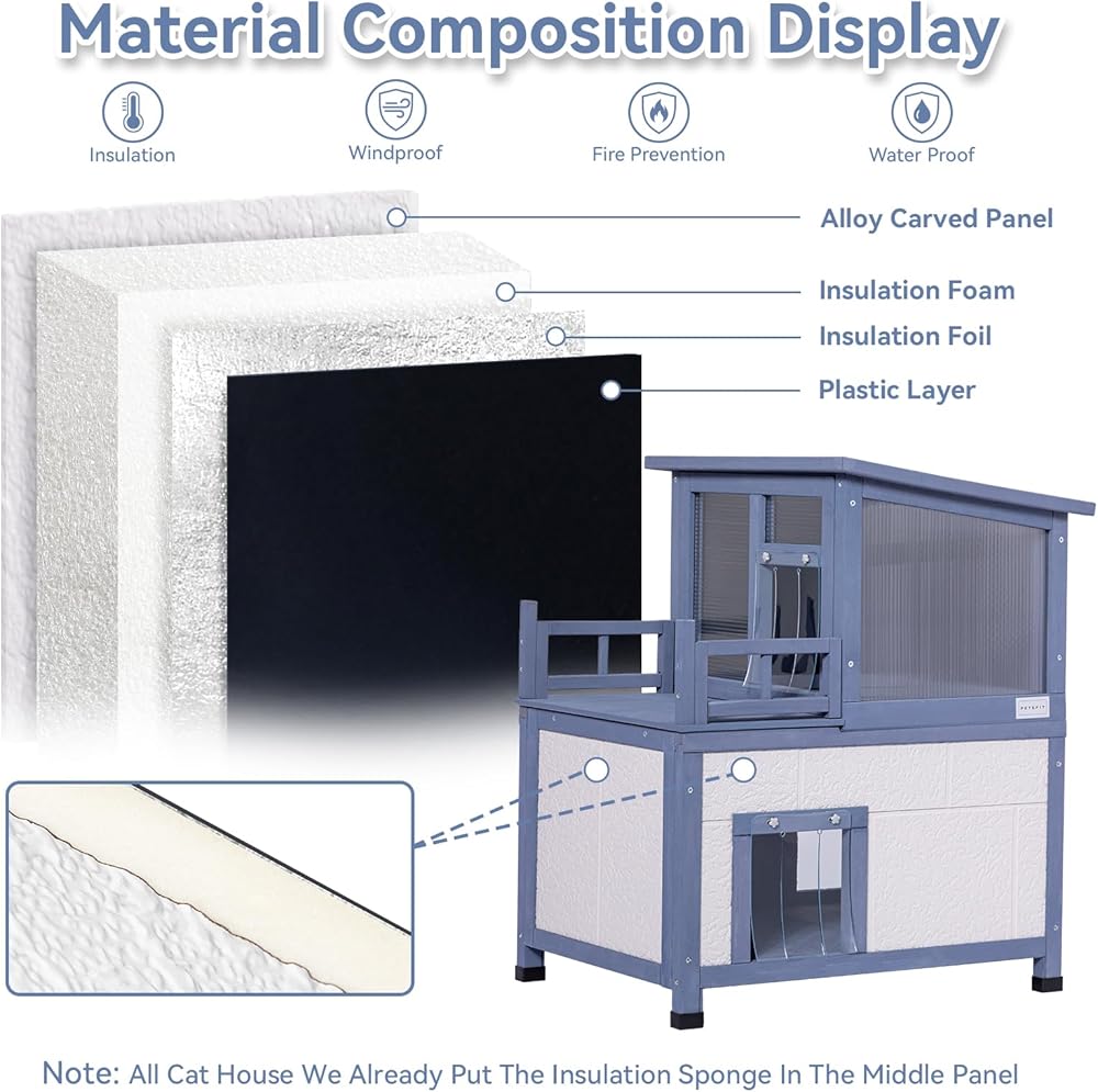 بيت القطط المعزول الخاص بنا، والذي يتميز بمستويين، تم بناؤه باستخدام مواد عازلة عالية الجودة، ومناسبة للاستخدام في الشتاء والصيف. بالإضافة إلى الجزء العلوي المعزول، قمنا بدمج ألواح أكريليك شفافة، تشبه غرفة التشمس، مما يسمح للقطط بالاستلقاء بشكل مريح في ضوء الشمس. تضم شرفة فسيحة، وتعد مكانًا مثاليًا للاسترخاء أو تناول الطعام.