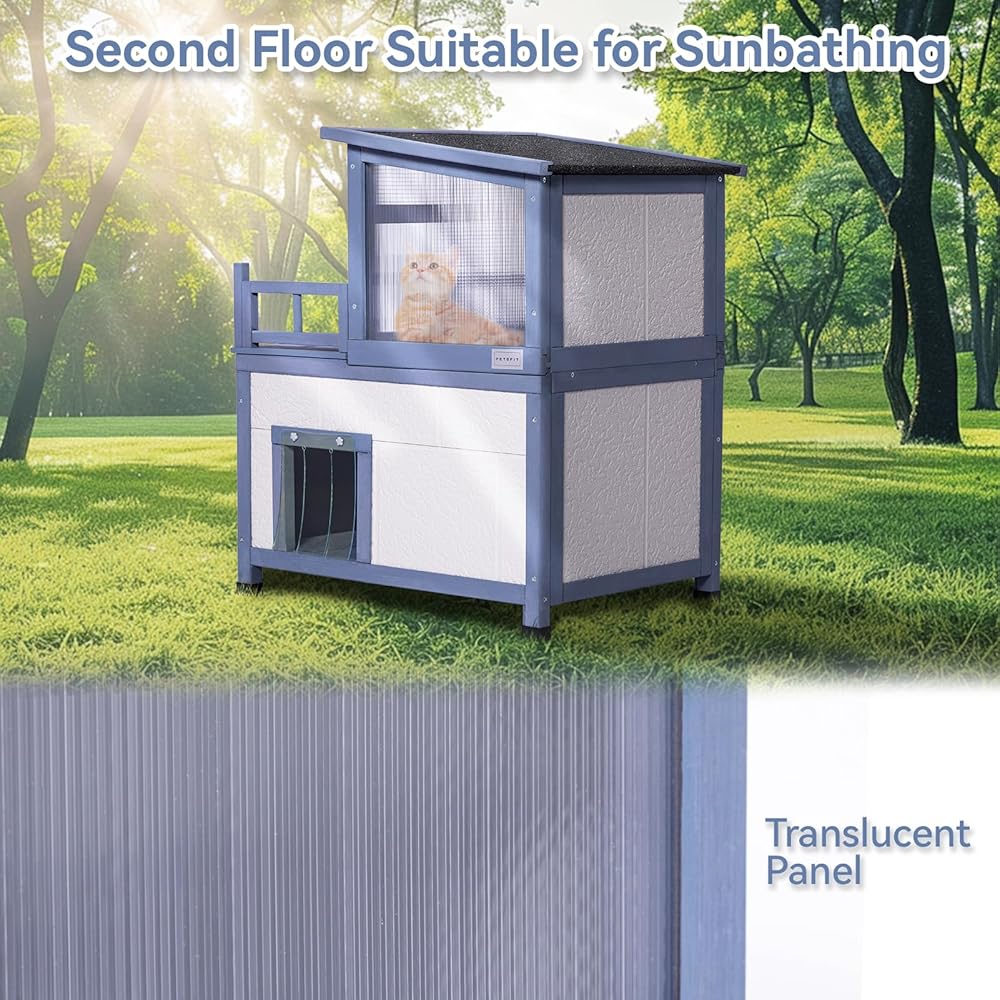 تم تصميم الطابق العلوي كغرفة مشمسة للقطط، ويضم ألواح أكريليك على الجانبين ومواد عازلة على الجوانب الأربعة الأخرى. المدخل يأتي مع رفرف الباب. أبعاد بيت القطط في الطابق العلوي هي 19 بوصة طول × 15 بوصة عرض × 13 بوصة ارتفاع، بينما تبلغ أبعاد الشرفة 19 بوصة طول × 10 بوصة عرض.