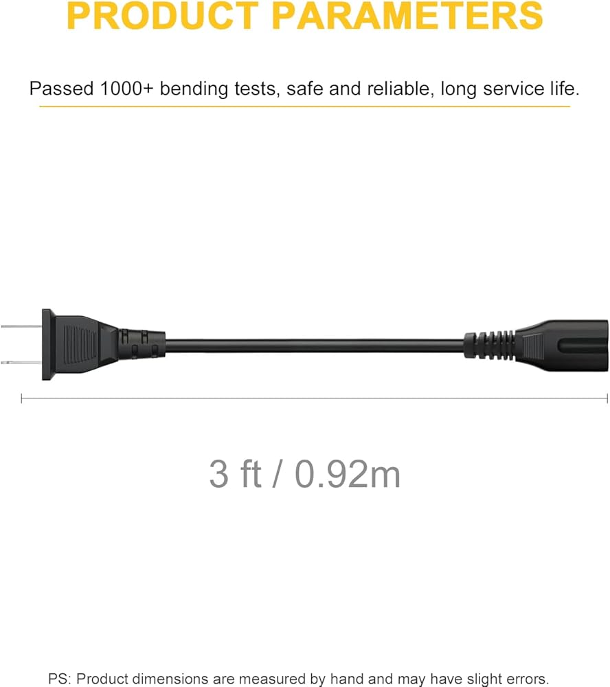 مواصفات الطاقة: (الشكل 8) سلك طاقة تيار متردد ثنائي الشق، سلك كابل طويل للغاية بطول 0.91 م/3 أقدام. غير مستقطبة، NISTP-1 2C 18AWG(0.824mm2) 105 درجة مئوية 300 فولت VW-1 و105 درجة مئوية 300 فولت FT2. / نوع قابس الموصل: IEC-60320 (IEC320) C7 إلى NEMA 1-15P.