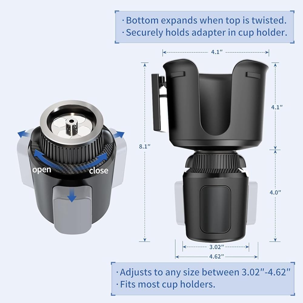 حامل أكواب عالمي مناسب: يأتي مع قاعدة قابلة للتوسيع لتوفير ملاءمة مثالية داخل السيارات أو الشاحنات أو أي مركبات أخرى مجهزة بحاملات أكواب قياسية. فقط قم بتدوير المقبض في اتجاه عقارب الساعة أو عكس اتجاه عقارب الساعة، والقاعدة المقابلة قادرة على تركيب حاملات أكواب السيارة التي يتراوح عرضها من 3.02 إلى 4.62 بوصة. تم إعداد هذا المنتج بقاعدة ثقيلة قابلة للتعديل بالإضافة إلى البلاستيك المتين، وسيغلق حامل الأكواب الخاص بك بشكل آمن.