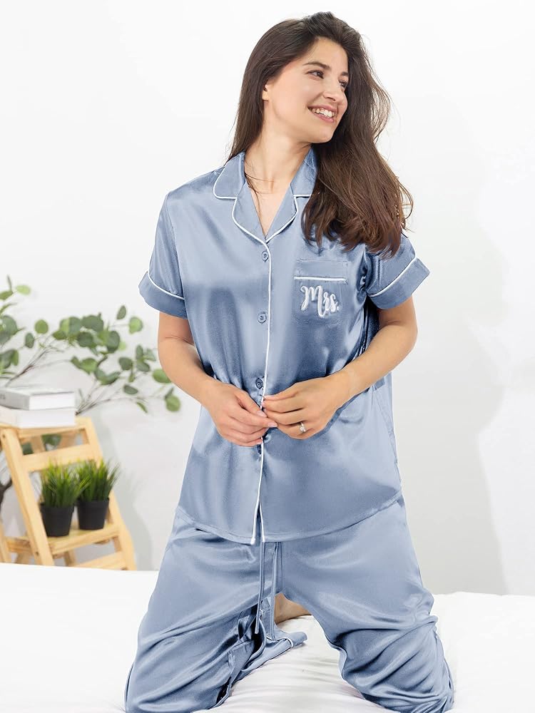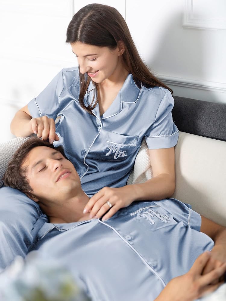 🧑🏻🤝🧑🏼【تصميم كلاسيكي】4 قطع من البيجامة المتطابقة للأزواج مع حرفي "Mr" و"Mrs" مطرزين على جيب الصدر الأيسر للحصول على مظهر كلاسيكي خالد. تشتمل البيجامة على أكمام قصيرة وأزرار سفلية مع ياقة مشقوقة؛ بنطال ناعم بطول كامل مع حزام خصر مطاطي قابل للتعديل لملاءمة مريحة. الأنماط الكلاسيكية والأنيقة مثالية للارتداء اليومي، أو بيجامات الزفاف، أو الملابس اليومية الخاصة، أو كهدية للسيد والسيدة.