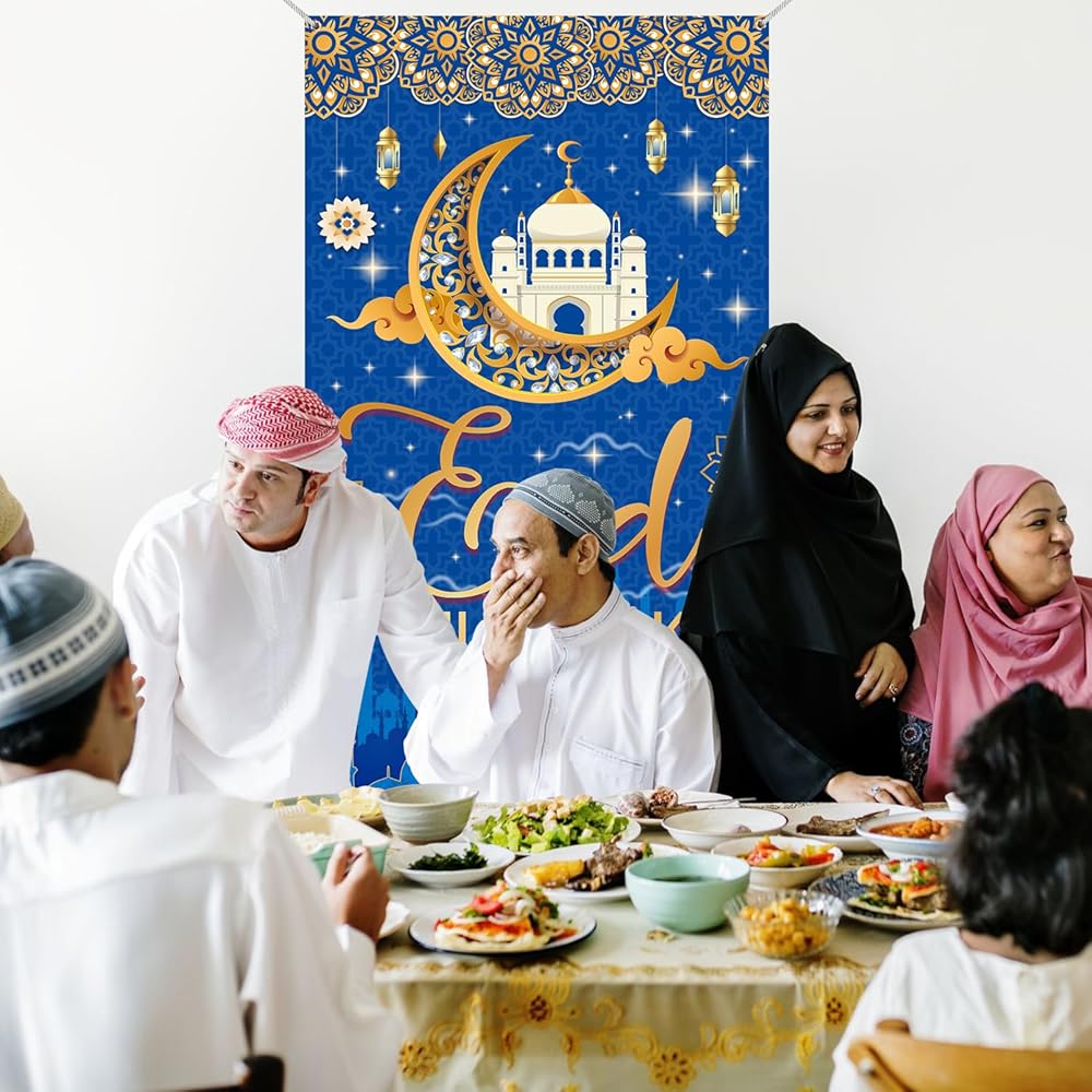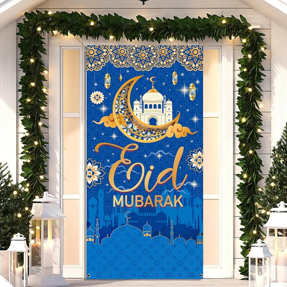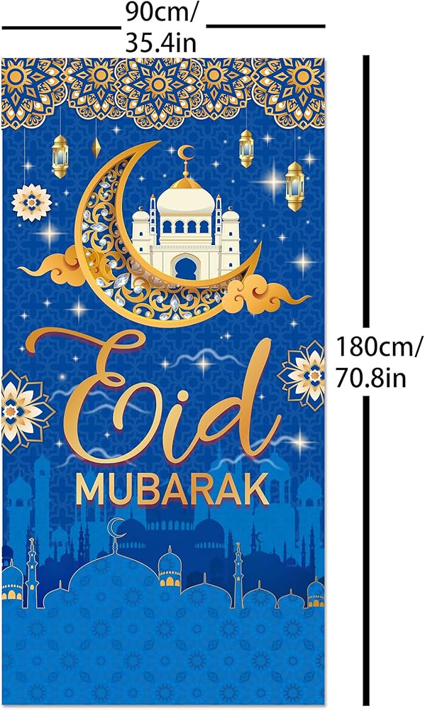 تصميم فريد: عيد مبارك! تتميز لافتة باب ديكورات رمضان عيد مبارك بالذهب الأزرق باعتباره اللون الرئيسي، وتصميم مع عناصر العيد المختلفة، بما في ذلك أضواء الفوانيس الإسلامية والمسجد والنجوم والقمر والمزيد ومطبوع عليها "عيد مبارك". في هذه المناسبة الخاصة، رحب بأقاربك وأصدقائك في احتفالك بالعيد مع خلفية متلألئة من زينة عيد مبارك.