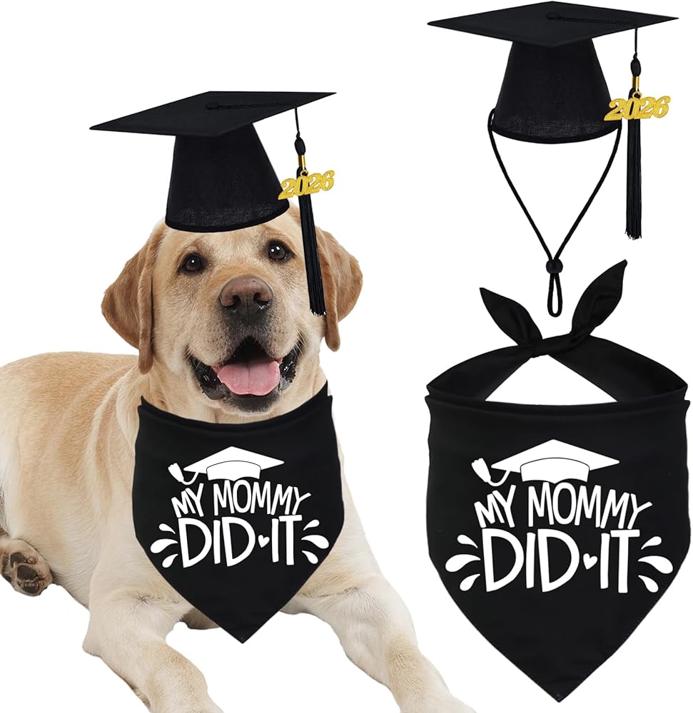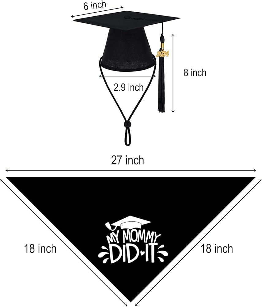 المقاس: مقاس منديل تخرج الكلاب: 27 بوصة × 18 بوصة × 18 بوصة، منديل تخرج الكلاب القابل للتعديل مناسب للكلاب تقريبًا. منديل تخرج الكلاب مناسب بشكل خاص للكلاب التي يبلغ محيط رقبتها أقل من 23 بوصة وأكثر من 10 بوصة. يبلغ مقاس قبعة التخرج للكلاب حوالي 15.24 سم × 15.24 سم × 2.9 سم، وهو ما يناسب معظم الكلاب.
