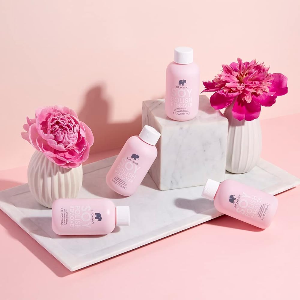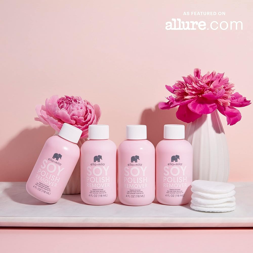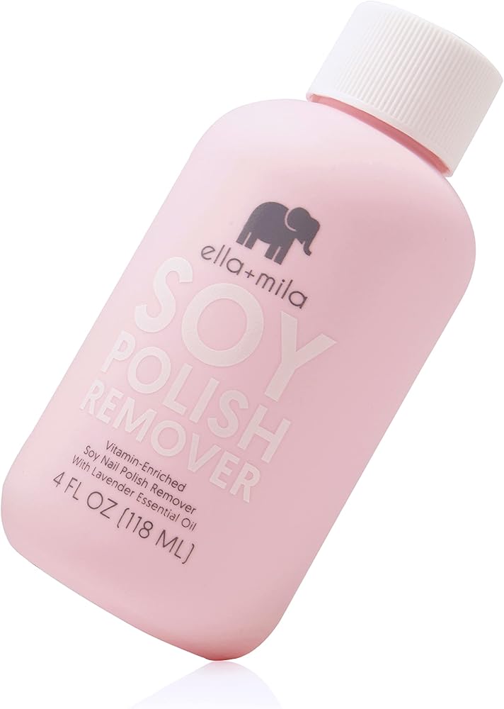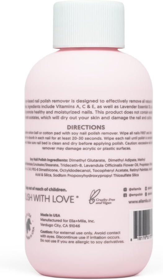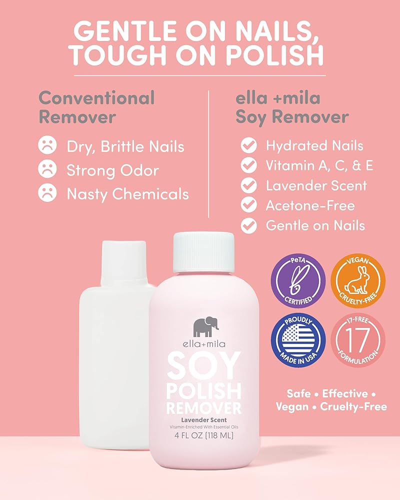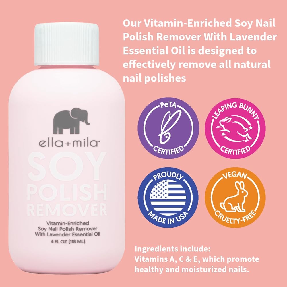 مزيل طلاء أظافر الصويا من إيلا + ميلا: مزيل طلاء أظافر غير سام مصنوع بدون الأسيتون والكحول؛ تم تركيبه لإزالة طلاء الأظافر الطبيعي بشكل فعال؛ غني بزيوت اللافندر الأساسية وفيتامينات A وC وE لتعزيز صحة الأظافر وترطيبها