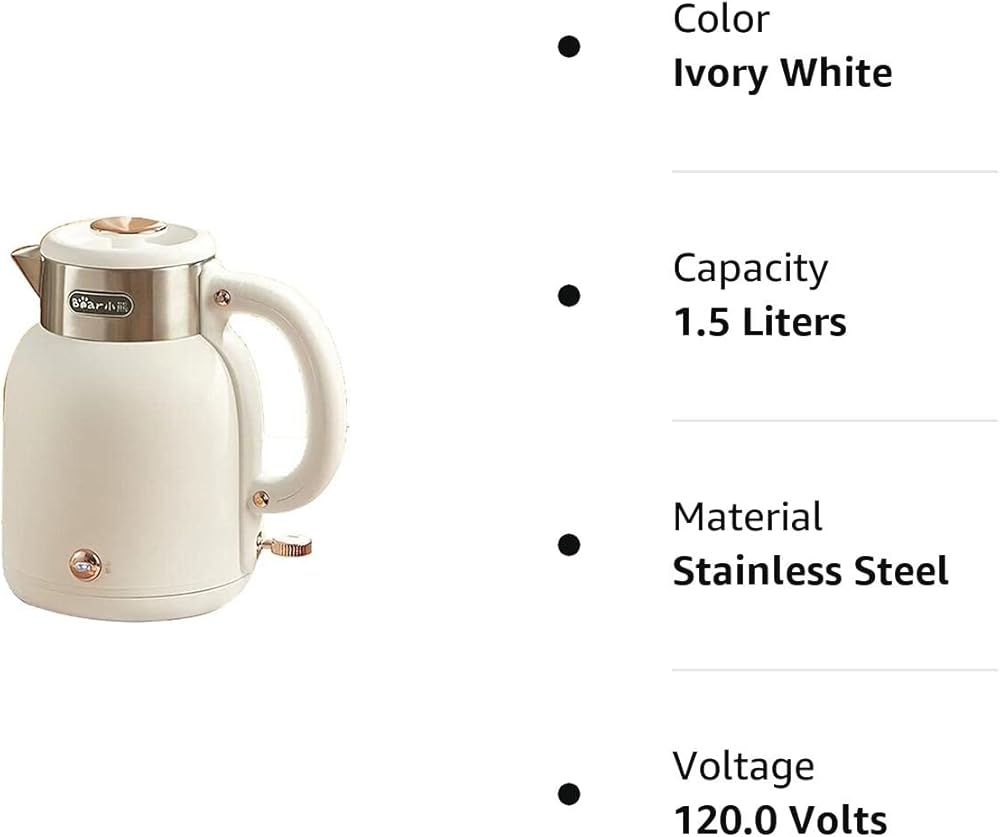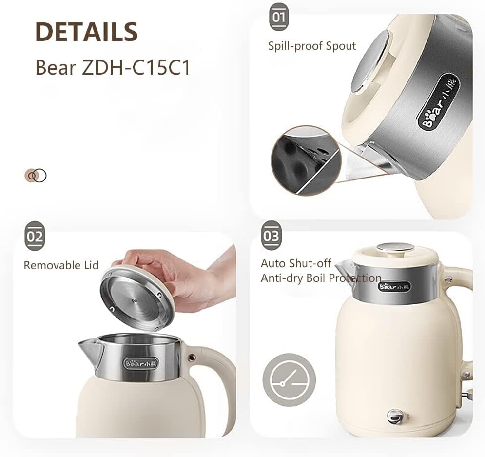 غلاية كهربائية من Bear ZDH-C15C1 للقهوة والشاي، غلاية مياه ساخنة من الفولاذ المقاوم للصدأ مع وظيفة الحفاظ على الدفء، إيقاف تلقائي، خالية من مادة BPA، 1.5 لتر، أبيض عاجي