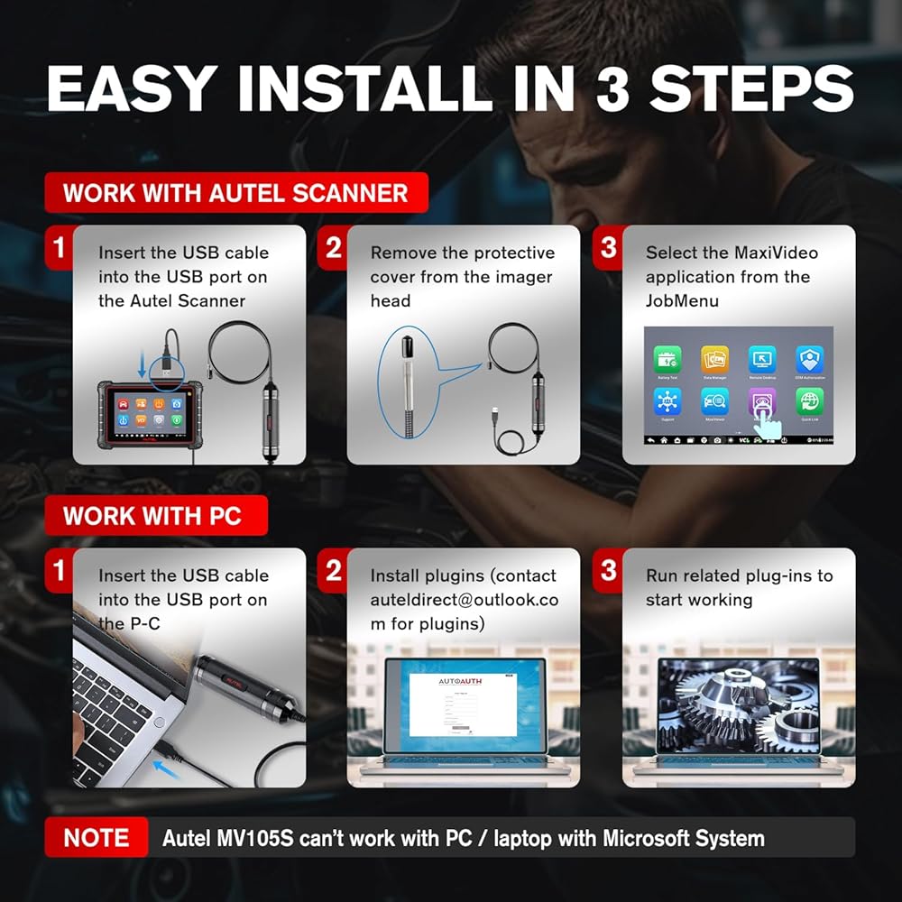 👍【متوافقة مع جميع الماسحات الضوئية】تتمتع كاميرا الثعبان Autel MV105S بنفس التوافق مثل MV108S، فهي تدعم ما يقرب من 100% من الماسحات الضوئية Autel، مثل: MX808S/ MK808S/ MK808BT PRO/ MX900/ MK808S-TS/ MP808S/ MP808S-TS/ MP808BT PRO/ DS808S-BT/ MS906 Pro/ MS906 Pro-TS/ MK908 PRO II/ Elite II PRO/ MS919/ Ultra/ Ultra Lite. يمكن استخدامه أيضًا مع الكمبيوتر الشخصي، لكنه لا يمكنه العمل مع الكمبيوتر الشخصي المزود بأنظمة MA-C. يرجى الاتصال بـ 🚘auteldirect@ outlook. com🚘 للحصول على المكونات الإضافية ذات الصلة إذا كنت تريد الاتصال بجهاز الكمبيوتر.