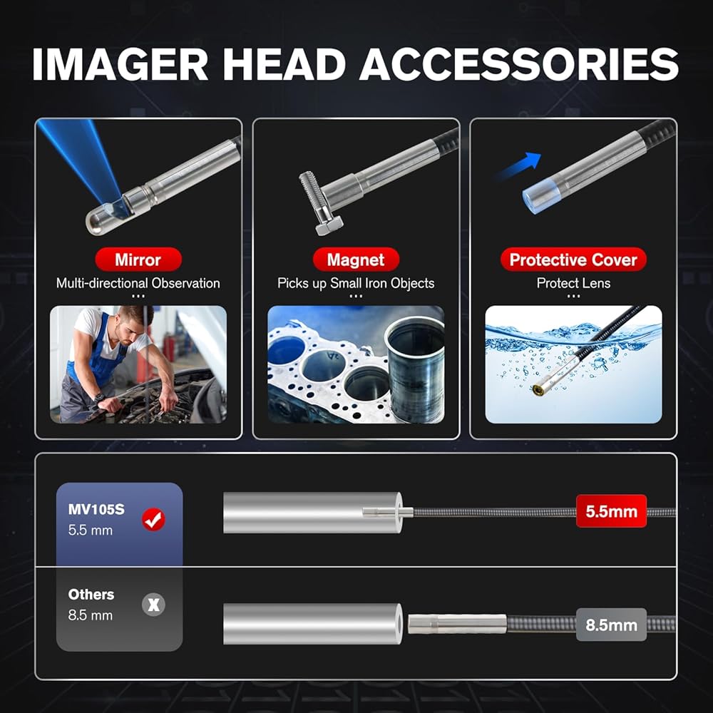 👍【ملحقات مفيدة، لا داعي للقلق بعد البيع】تأتي كاميرا الفحص بالمنظار الصناعي Autel MaxiVideo MV105S مع مغناطيسات ومرايا: يمكن للمغناطيسات جذب الأجسام الحديدية الخفيفة والصغيرة، وتوفر المرايا المزيد من المناظر من زوايا مختلفة. تتمتع الكاميرا التنظيرية المتكاملة المصممة هندسيًا بسياسة إرجاع واستبدال مجانية لمدة 30 يومًا. إذا كانت لديك أي أسئلة، فيرجى الاتصال بقسم ما بعد البيع لدينا: 🚘auteldirect@ outlook. com🚘.