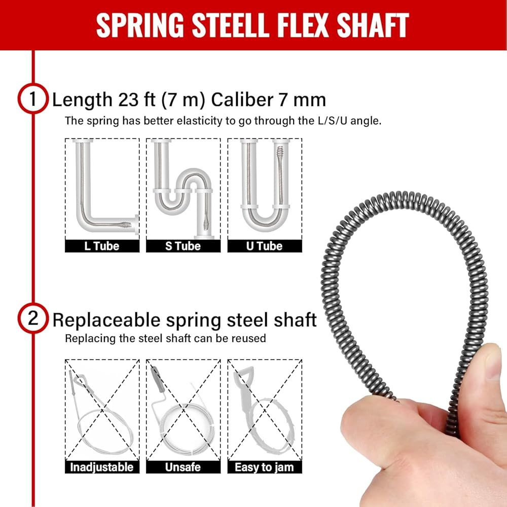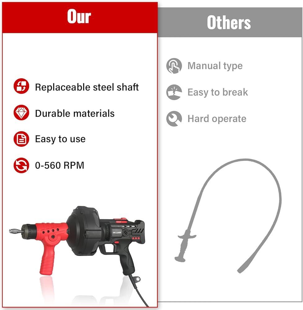 • يأتي ثعبان الصرف الكهربائي مزودًا بكابل بطول 23 قدمًا قابل للاستبدال، والذي غالبًا ما يكون مناسبًا لصيانة خطوط الأنابيب المنزلية. يمكننا بسهولة إزالة الانسدادات في الأنابيب بأقطار تتراوح من 3/4 بوصة إلى 2 بوصة. بالمقارنة مع الأدوات اليدوية التقليدية، فإن ثعبان الصرف الخاص بنا يوفر الوقت والجهد، مما يجعل عملية فك الأنابيب أسهل.
