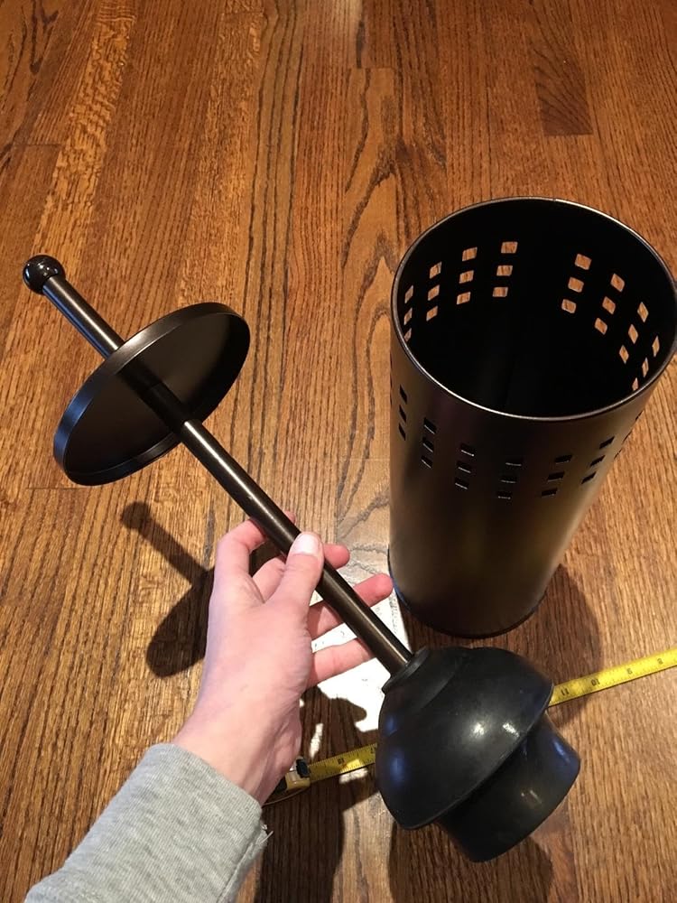 تصميم أنيق وبسيط: مكبس المرحاض مع حامل مصنوع من الحديد مع طلاء مسحوق لمنع الصدأ. حتى عندما يتم وضع المكبس بالداخل وهو مبلل، توجد فتحات تهوية في الجزء العلوي من الحامل للسماح للمكبس بالجفاف بسرعة بين الاستخدامات