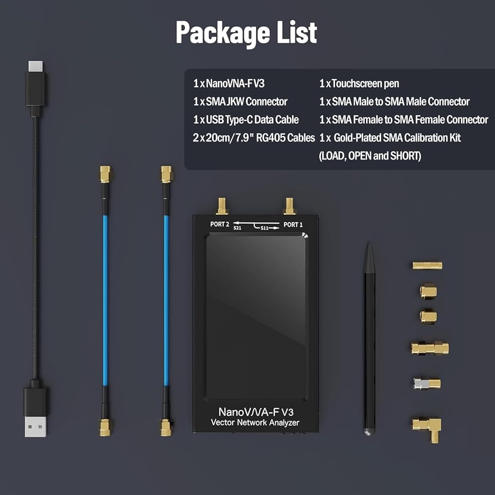 🎁【ما ستحصل عليه: 】: تشتمل مجموعة nanovna-f v3 ذات القيمة المُحدثة من Seesii على 1 × NanoVNA-F V3، 1 × مجموعة معايرة SMA مطلية بالذهب (تحميل، مفتوح وقصير)، 1 × موصل SMA أنثى إلى SMA أنثى، 1 × موصل SMA ذكر إلى SMA ذكر، 1 × موصل SMA JKW، 2 × 20 سم / 7.9 بوصة كابلات RG405، 1 × كابل بيانات USB من النوع C. توفر Seesii خدمة فنية على مدار 7*24 ساعة وخدمة استرداد الأموال لمدة 90 يومًا، ضمان لمدة 3 سنوات، دعم العملاء مدى الحياة، يمكنك استخدامه بثقة.