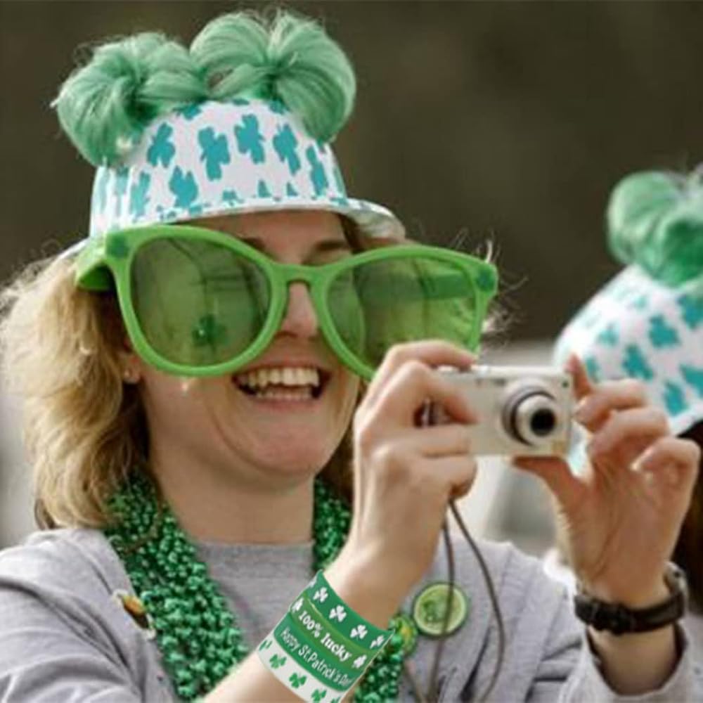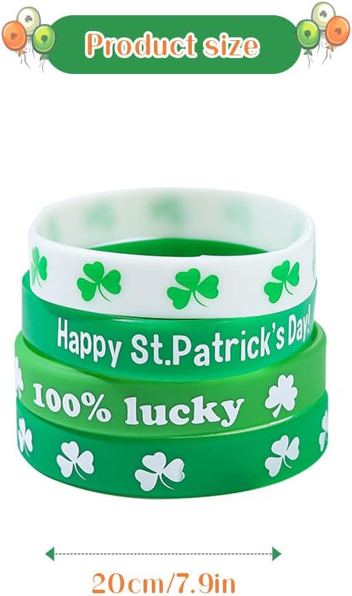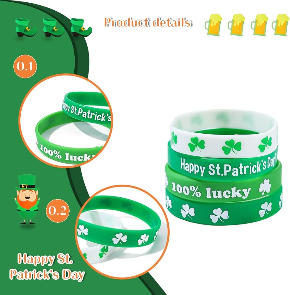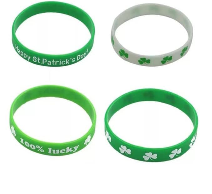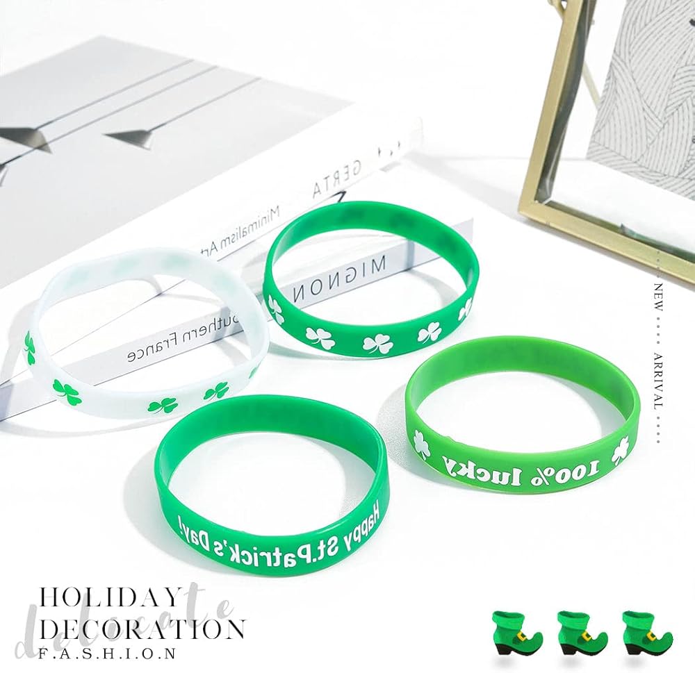 • تطبق الأساور المطاطية أنماط نبات النفل والألوان البيضاء الخضراء، وهي العناصر الكلاسيكية لعيد القديس باتريك التي ترمز إلى الحظ السعيد والأمل، وهي مطبوعة بعبارات مباركة متنوعة، تلبي الأجواء المبهجة
