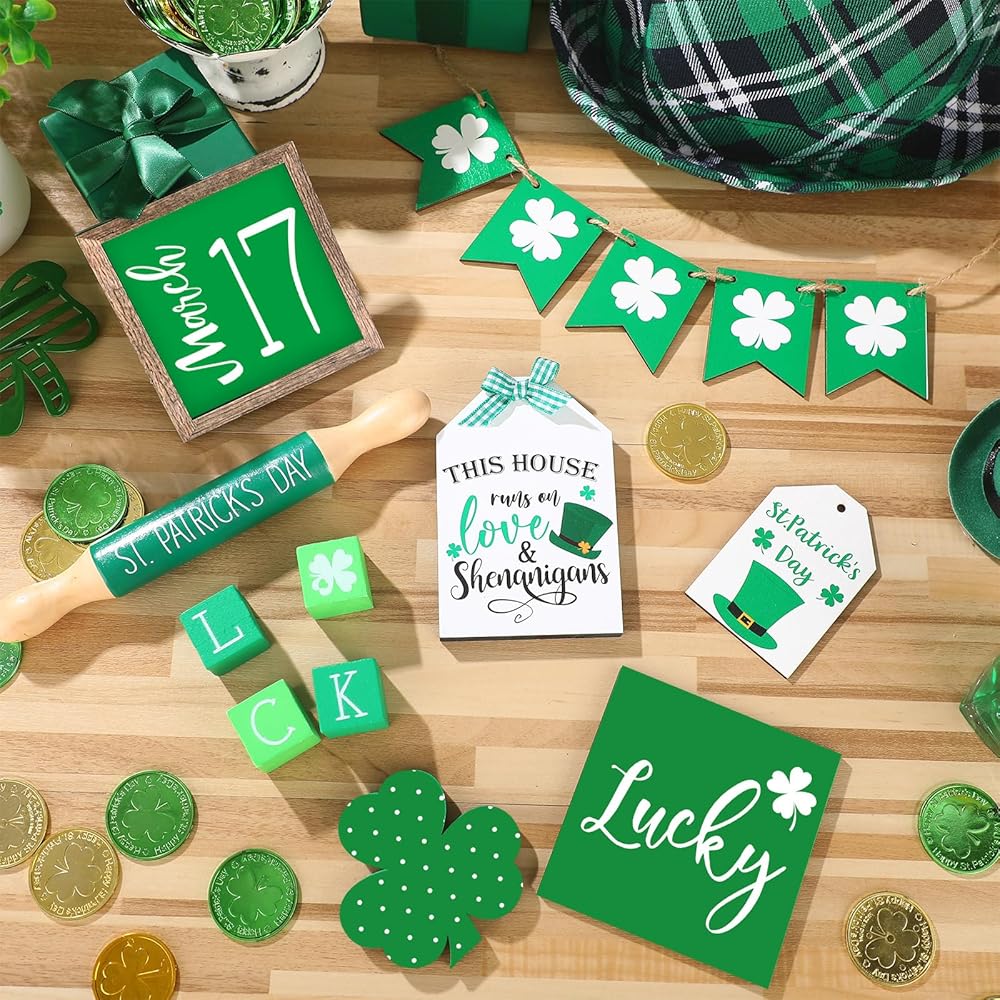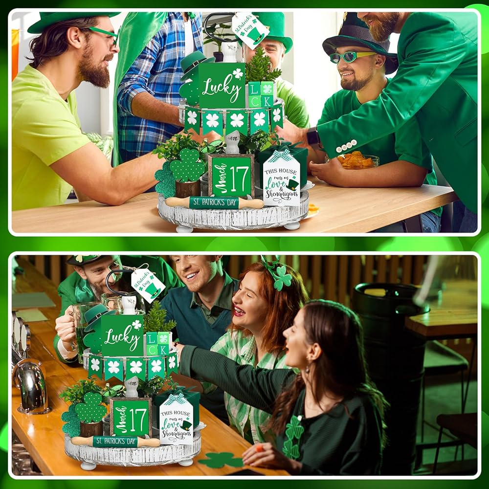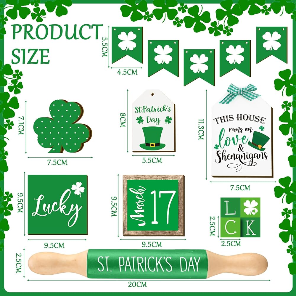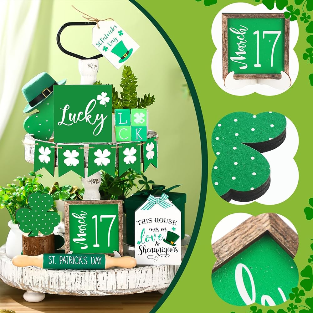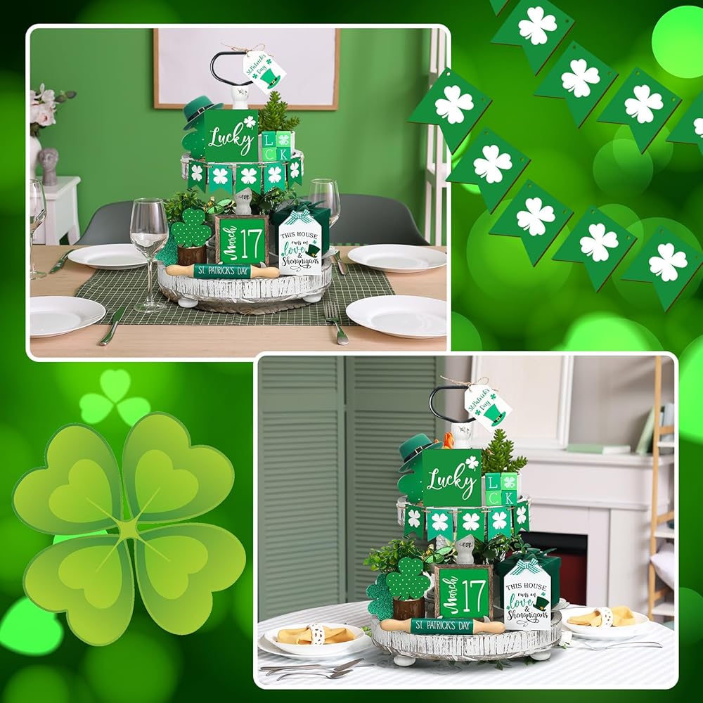 تصميم عيد القديس باتريك: تم تصميم مجموعة الديكور الخشبية هذه مع نبات النفل، الذي يرمز إلى الحظ والسعادة، وتصميمات المهرجانات الأيرلندية الأخرى ذات الصلة رائعة لتزيين الصواني ذات الطبقات وطاولات المطبخ، ووضعها في خزانتك أو طاولة الطعام.