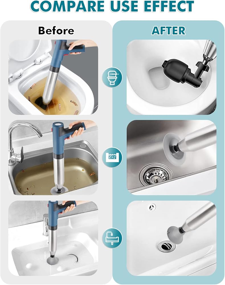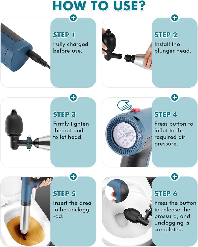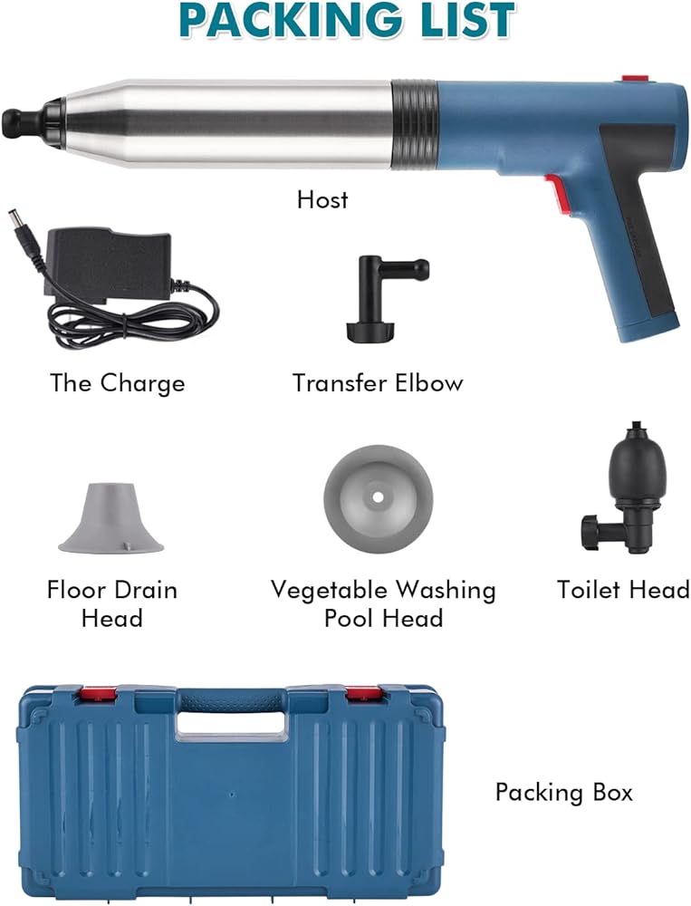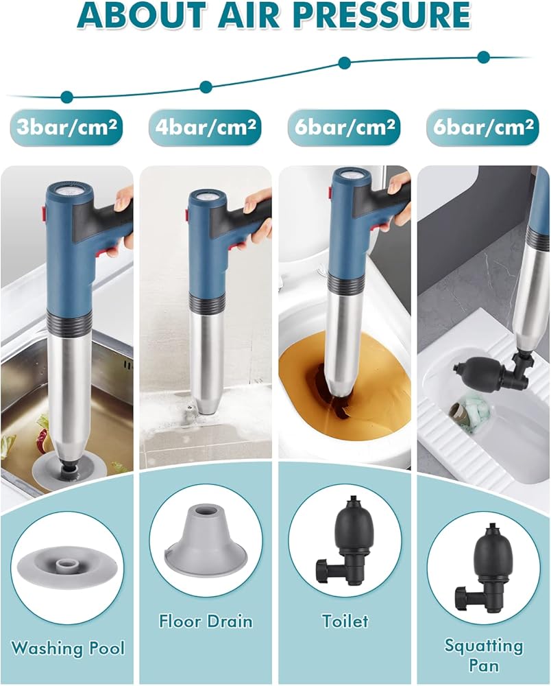 4. 【تطبيق متعدد الاستخدامات 】-- ناسف تصريف الهواء مناسب للأنابيب المسدودة في المراحيض وأحواض الاستحمام ومصارف الأرضيات والأحواض وخزانات الخضروات وما إلى ذلك. قبل الاستخدام، يرجى ضبط الضغط لتلبية احتياجات التجريف المختلفة، نوصي بـ 2-3 بار. للحوض، 3-4 بار لحوض الخضروات، 4-5 بار لتصريف الأرضية، 5-6 بار للمرحاض، و7-8 بار للضغط العالي.