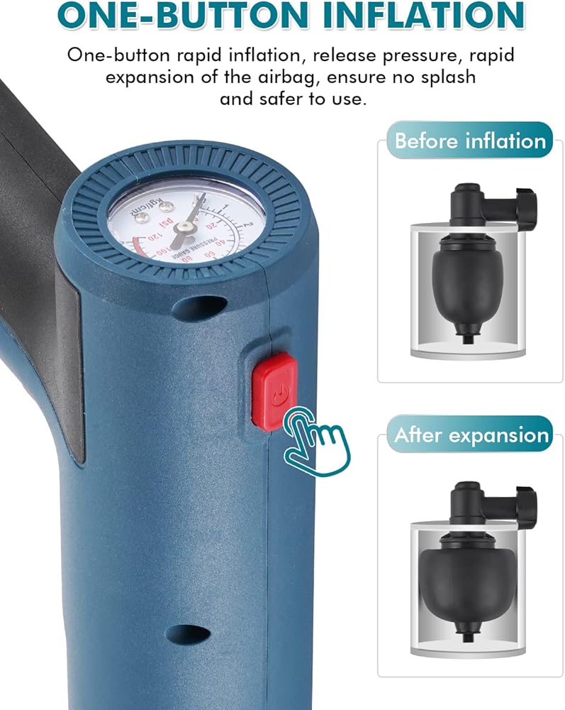 1. 【شحن بطارية الليثيوم 】-- اعتماد تصميم شحن بطارية الليثيوم، بعد شحنها بالكامل، يمكن استخدامها لمدة 30 مرة تحت 4 بار (58 رطل لكل بوصة مربعة)، وهو مناسب للاستخدام ويوفر الوقت والجهد.
