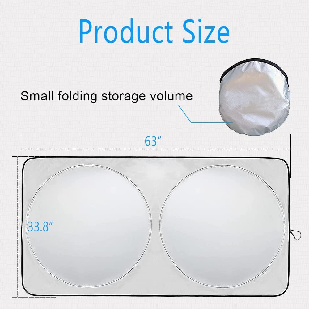 • [يستخدم على نطاق واسع]: يحتوي واقي الشمس القابل للطي على مقاسين للاختيار من بينها 59 * 27.6 بوصة/63 * 33.8 بوصة، والتي يمكن أن تستوعب معظم موديلات الشاحنات أو سيارات الدفع الرباعي أو الشاحنات أو السيارات. يرجى التأكد من أن حجم مظلة الشمس للزجاج الأمامي للسيارة مناسب للزجاج الأمامي الخاص بك قبل الشراء.