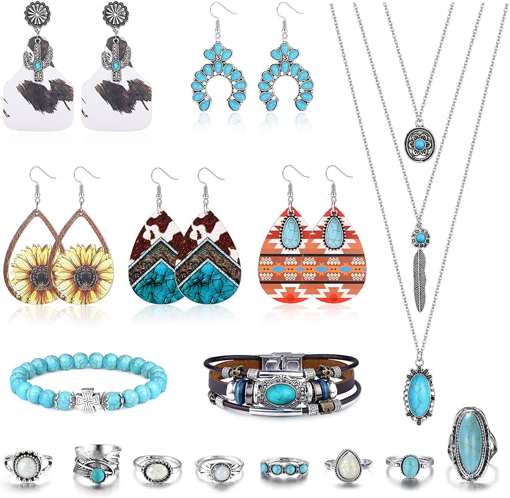 💯 【مجوهرات يدوية الصنع لطيفة】--مجموعة المجوهرات الفيروزية الغربية مصنوعة من سبائك عالية الجودة، وأقراط زهر السكواش والقلائد الغربية مصنوعة من الفولاذ الجراحي الذي لا يسبب الحساسية. السوار الجلدي الملتف بحجر الفيروز هو تصميم منسوج يدويًا بشكل عام يضمن يمكنك الحصول على قطعة مجوهرات فريدة من نوعها. فهي قوية وليس من السهل أن تتلاشى أو تتآكل أو تنكسر، مما يضمن ارتداؤها طويل الأمد. عزز هالتك واخلق إحساسًا بالجمال.