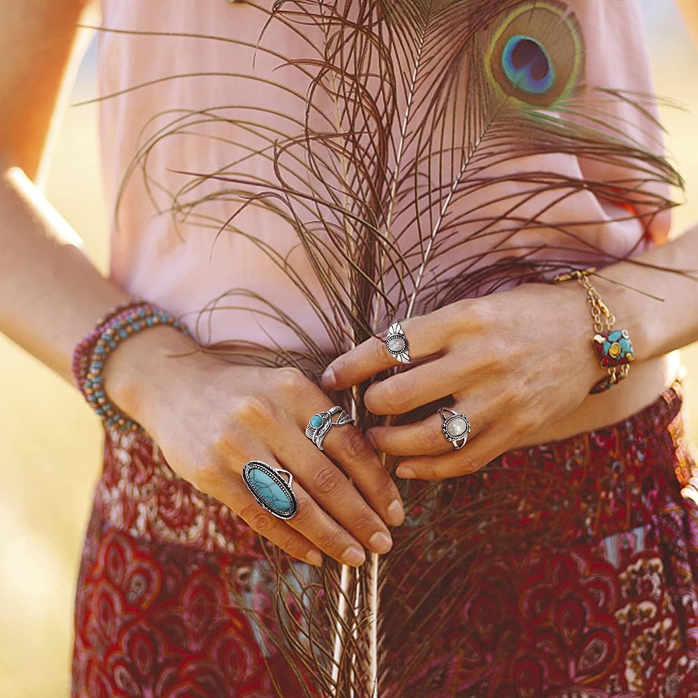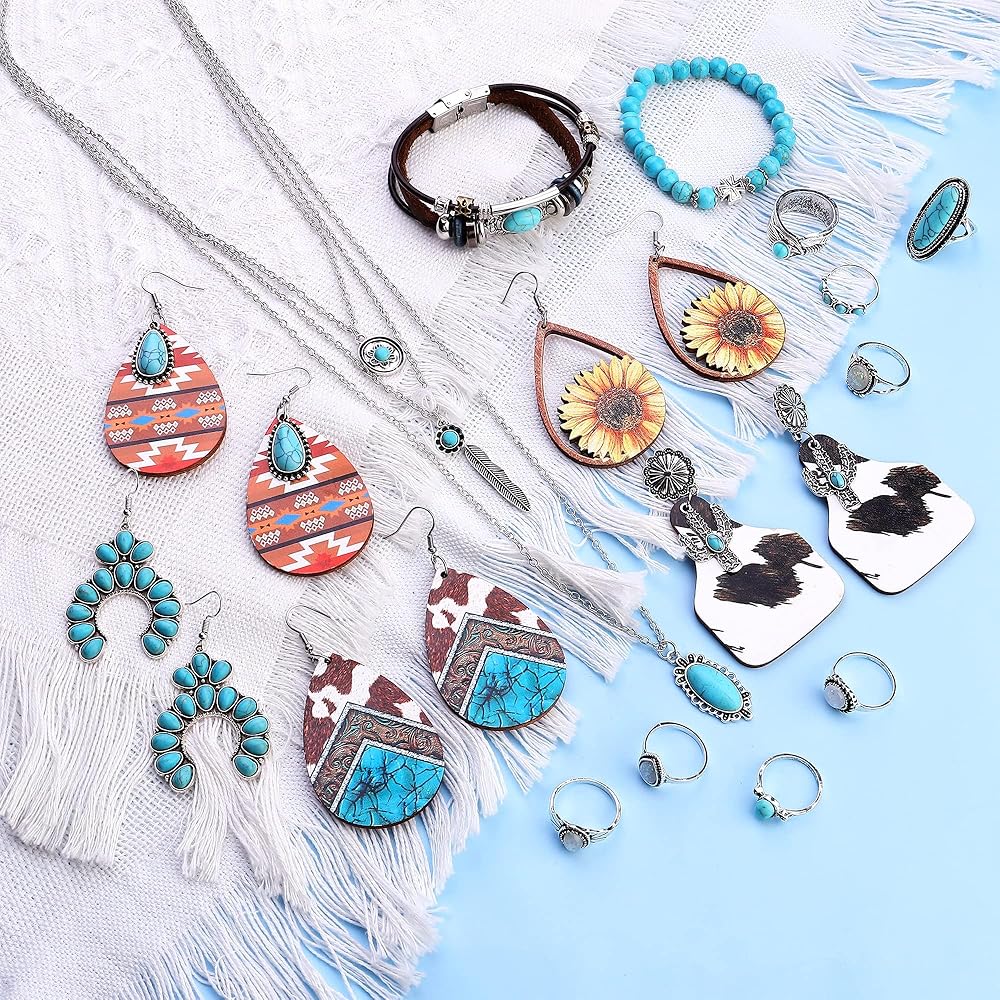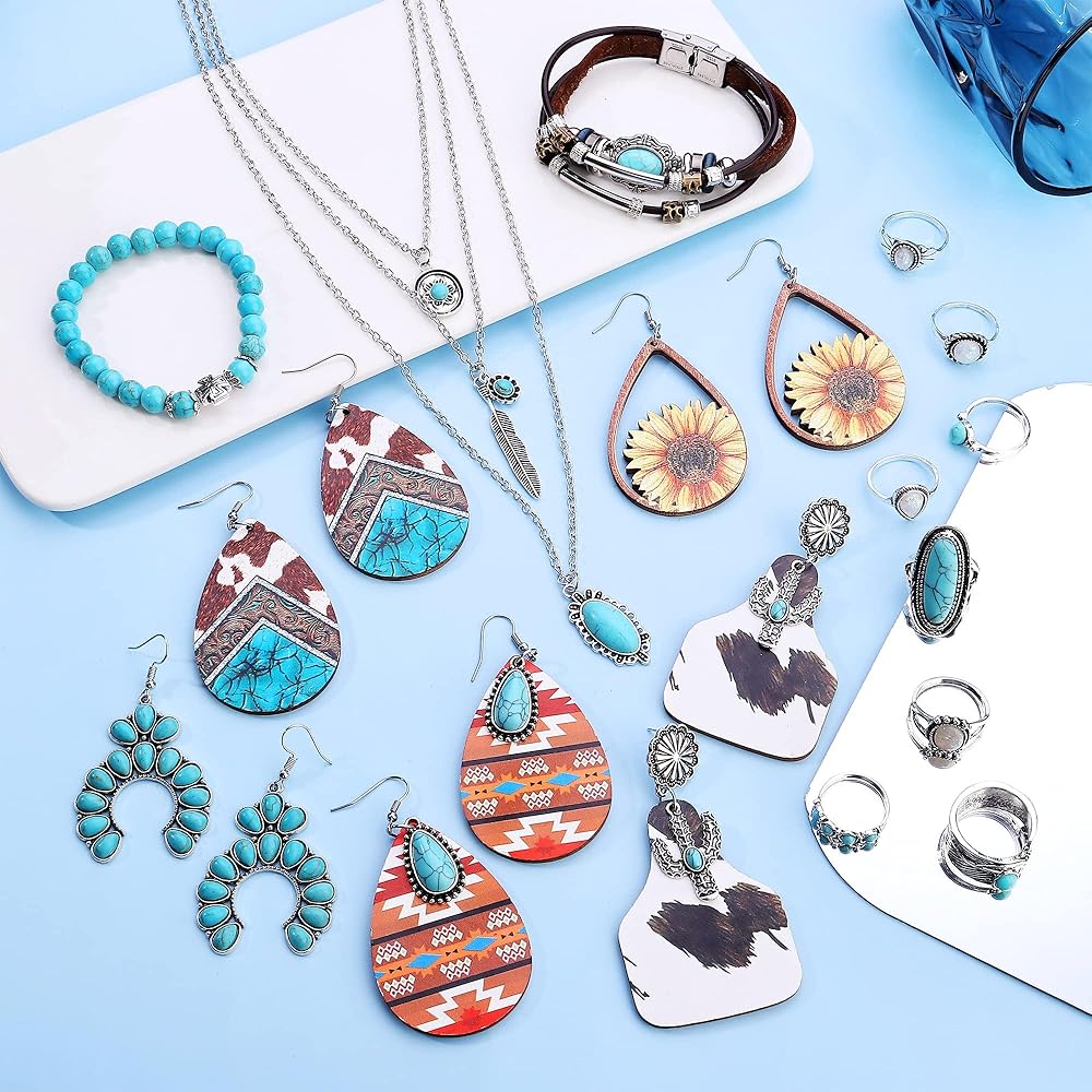 💯 【مجموعة المجوهرات الفيروزية البوهيمية】--مجموعة مجوهرات بوهو الجميلة تتضمن 5 أزواج من الأقراط المتدلية الفيروزية، وقلادة فيروزية بوهيمية، وسوارين فيروزي مطاطي وسوار واحد من طبقات وبعض الخواتم الفيروزية. أنماط وكميات كافية لتناسب احتياجاتك المطابقة.