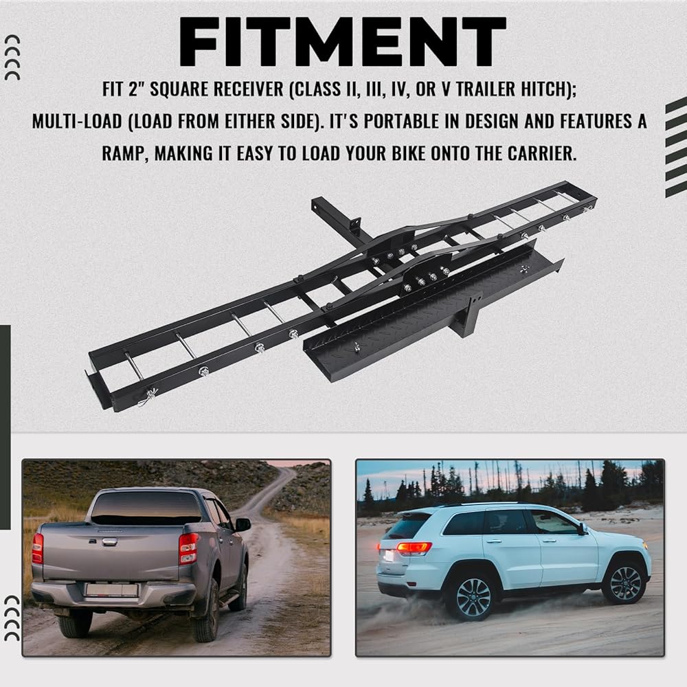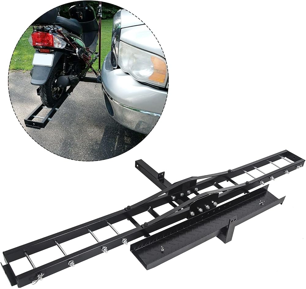 تصميم فريد: يمنع جهاز القفل المضاد للإمالة الخاص بالناقل من الاهتزاز أثناء النقل. فهو يضمن النقل الآمن حتى على الطرق الوعرة ويحافظ على ثبات دراجتك النارية بقوة على الحامل الموجود في الجزء الخلفي من سيارتك.