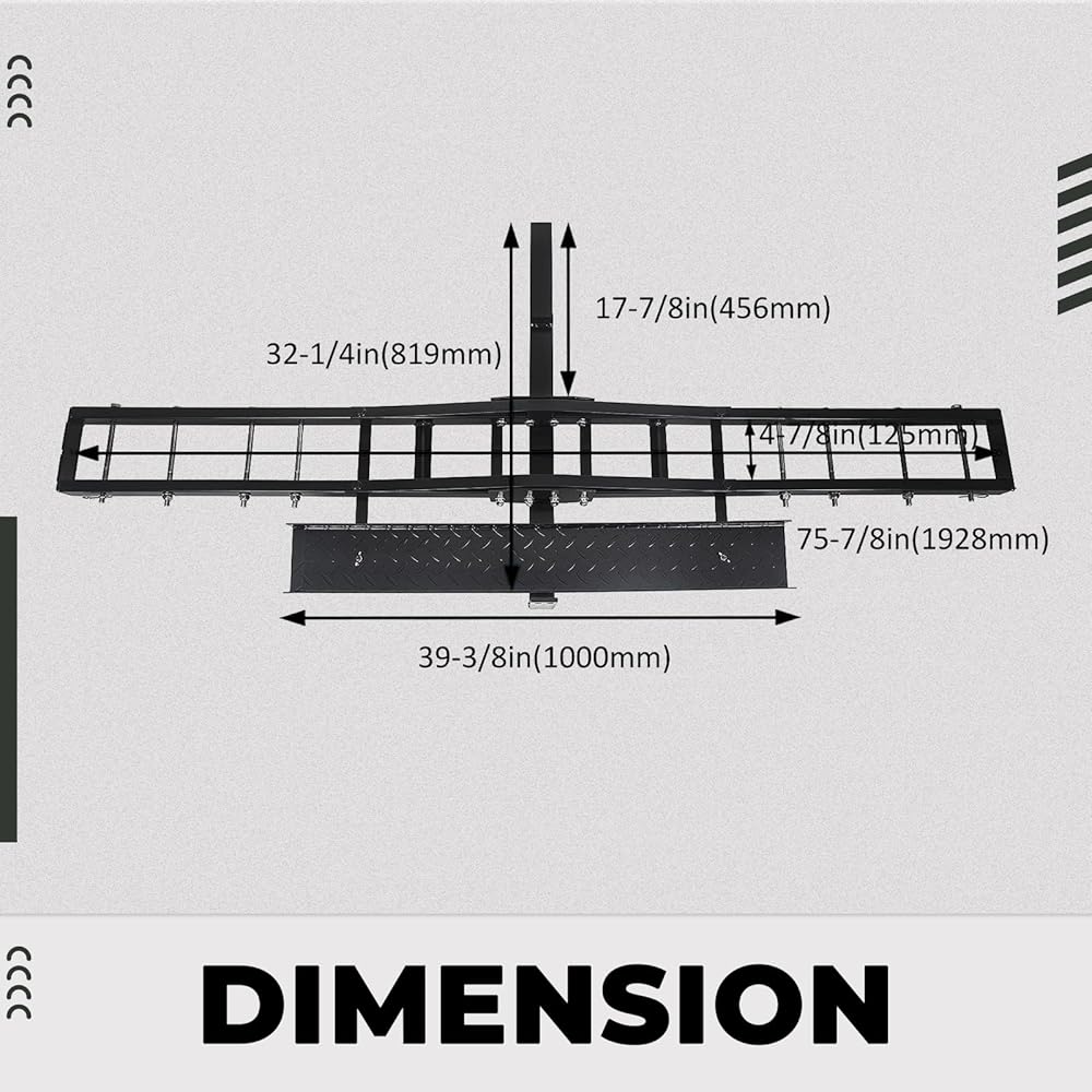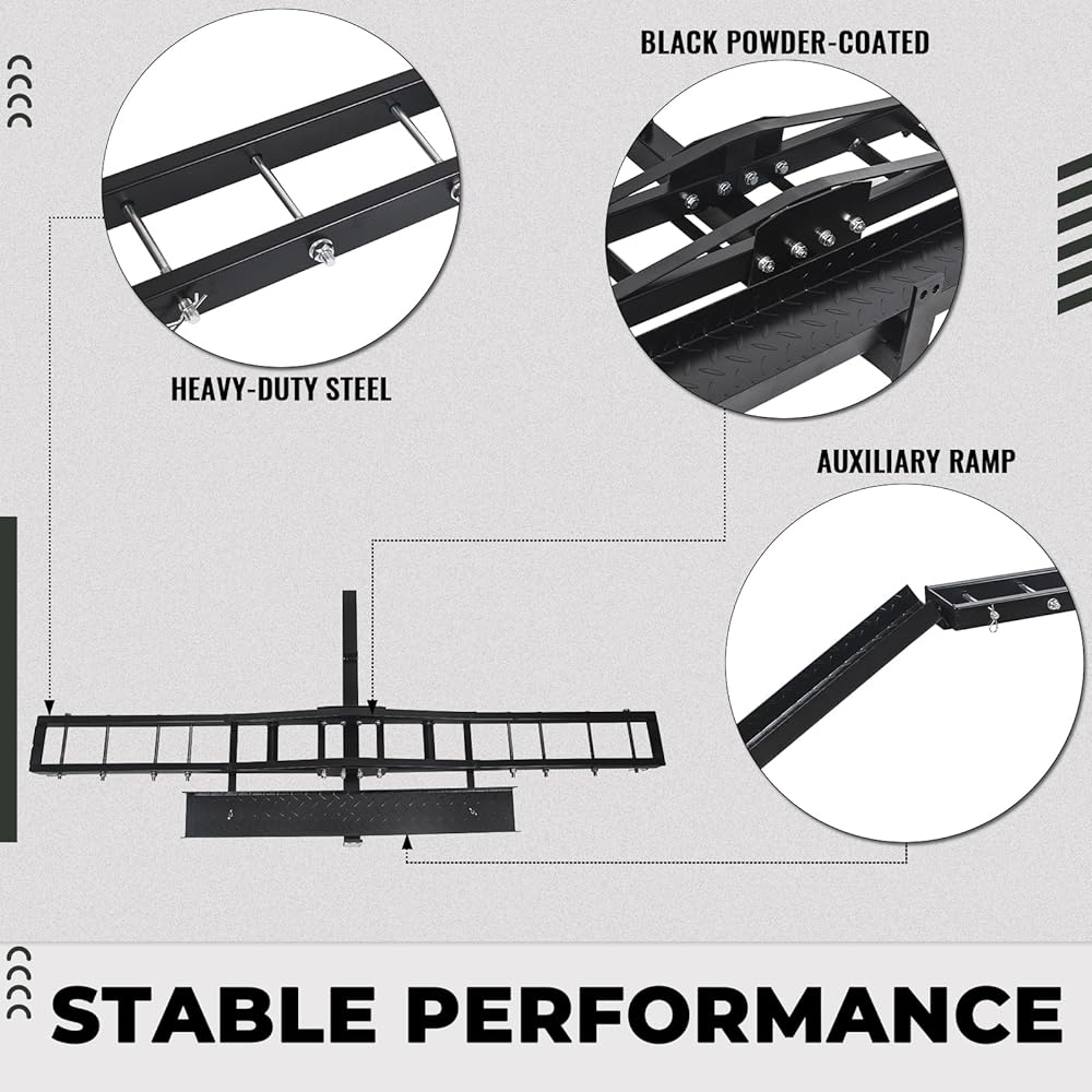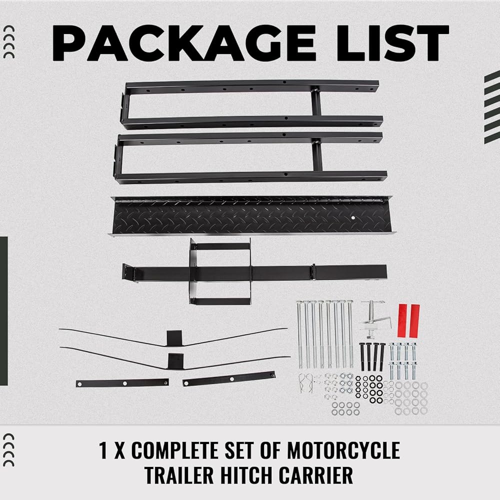 المعلمات العامة: عليك ملاحظة أن وصلة المقطورة غير متضمنة. الأبعاد الإجمالية للحامل هي 76 بوصة (طول) × 7 بوصة (عرض)، مع قياس منحدر التحميل 38.5 بوصة (طول) × 4.75 بوصة (عرض). حجم أنبوب الربط الرئيسي هو 18 بوصة (طول).