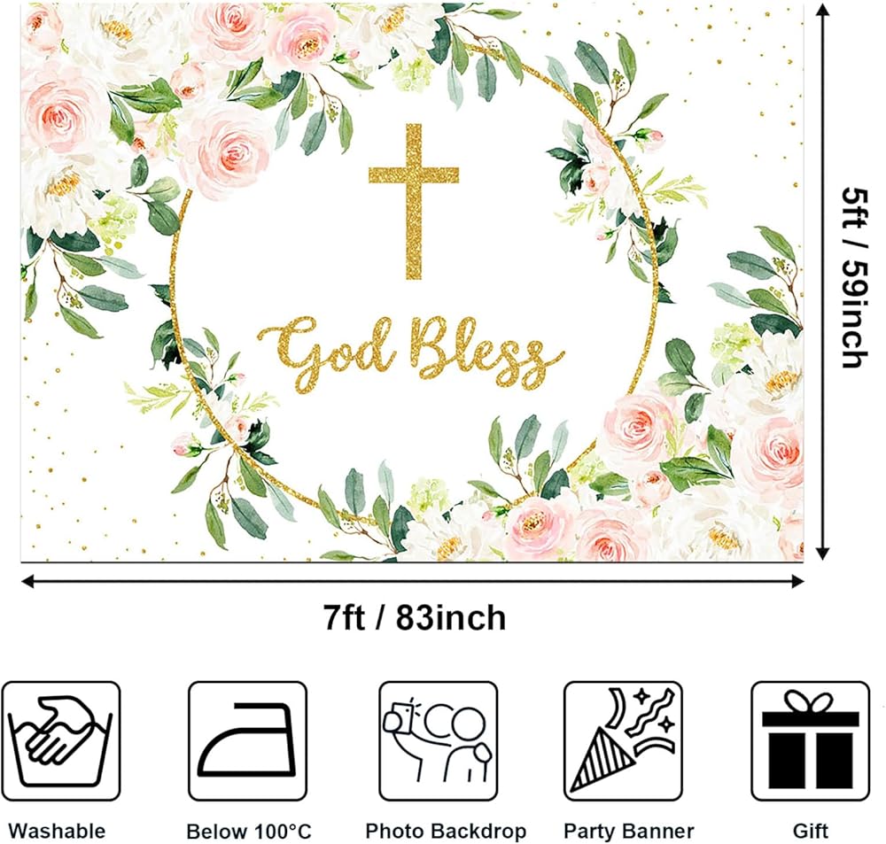 ★【الاستخدام】 إذا كنت تخطط لاستضافة حدث رائع لديكورات المناولة فتاة صبية، يجب أن تكون خلفية حفلة God Bless هذه وخلفية المناولة المقدسة الأولى اختيارًا رائعًا. عند نشرها في الخارج، ستحدث فرقًا كبيرًا في الديكورات. مناسبة لخلفية طاولة الكيك، وحفلات استقبال المولود الجديد، وحفلات المعمودية، وحفلات الزفاف، ودعائم التصوير الفوتوغرافي لحديثي الولادة وغيرها من مناسبات الحفلات.