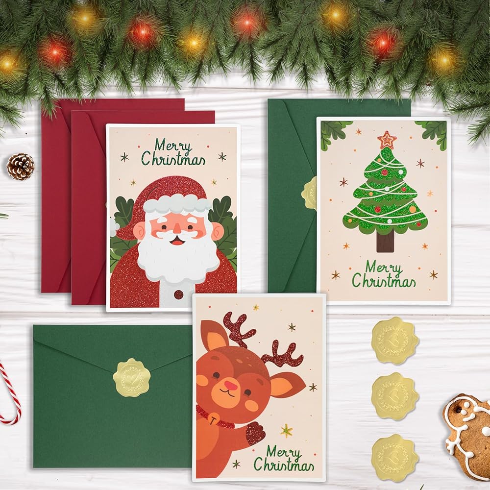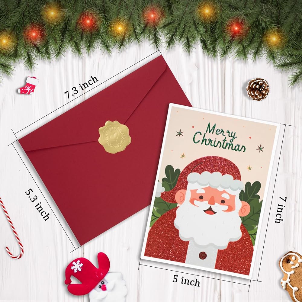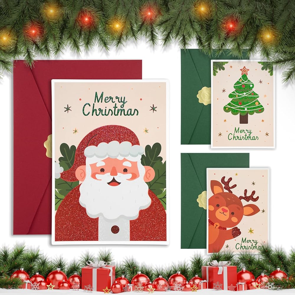 بطاقات عيد الميلاد مع مظاريف AZAZA-مظاريف حمراء مظاريف خضراء (3 تصاميم، 3 بطاقات و4 مظاريف) بطاقات سانتا كلوز، بطاقات شجرة عيد الميلاد، أظرف 5x7 للدعوات