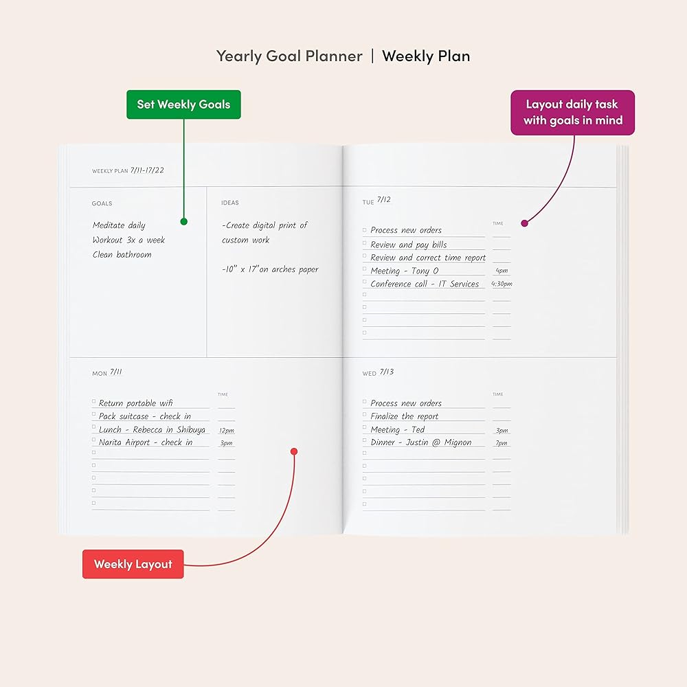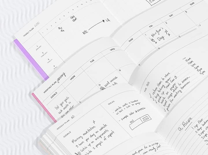 تصميم غير مؤرخ ومفتوح التاريخ: قم بفك قيود خططك من خلال تصميمنا المفتوح التاريخ، المكتمل بالأقسام السنوية والشهرية والأسبوعية. استخدم مناطق "ملاحظات العملية" لتدوين الأفكار وعناصر العمل. قم بتخصيص إنتاجيتك دون تعقيد.