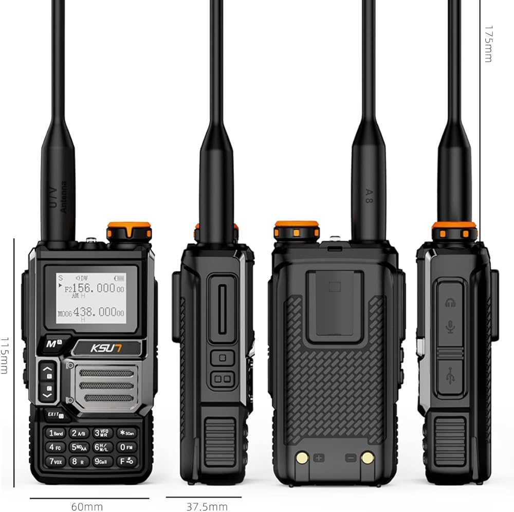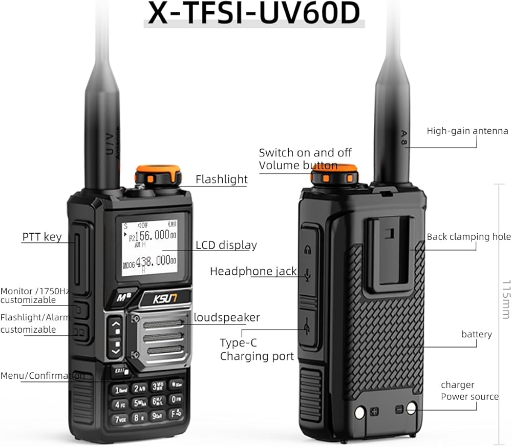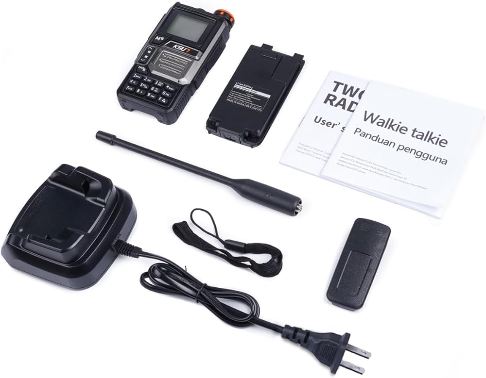 مصباح يدوي: يحتوي جهاز الاتصال اللاسلكي على وظيفة مصباح يدوي مدمج، والتي يمكن استخدامها في الليل أو في حالات الإضاءة المنخفضة. هذه الميزة مفيدة بشكل خاص للمخيمين والمتنزهين وأي شخص آخر يقضي وقتًا في الخارج ليلاً. يمكن أيضًا استخدام المصباح اليدوي للإشارة إلى المساعدة في حالات الطوارئ.